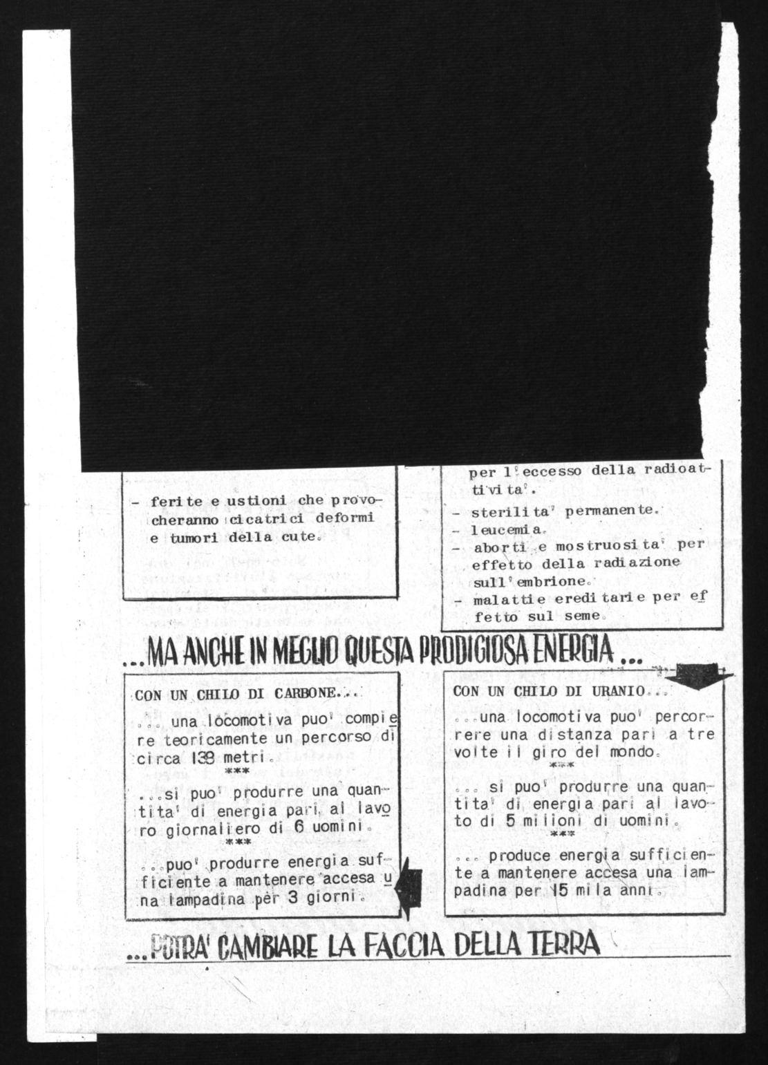 Solo cosi t noi concepiamo 1' u ti 11 zzazione dell'energia atomi ca: grandi centrali elettriche azionate della energia atomica; gli elettro domestici in oggi casa; i/ Divoro della massaia reso meno faticoso. Spetta quindi da og gi alla donna r tino da questo seinen to r fare tu ttoquanto e' nelle sue possibilita' per allonta n are dal mondo l' angoscia della guerra atomica e creare le condizioni della sicurezza e del benessere. J