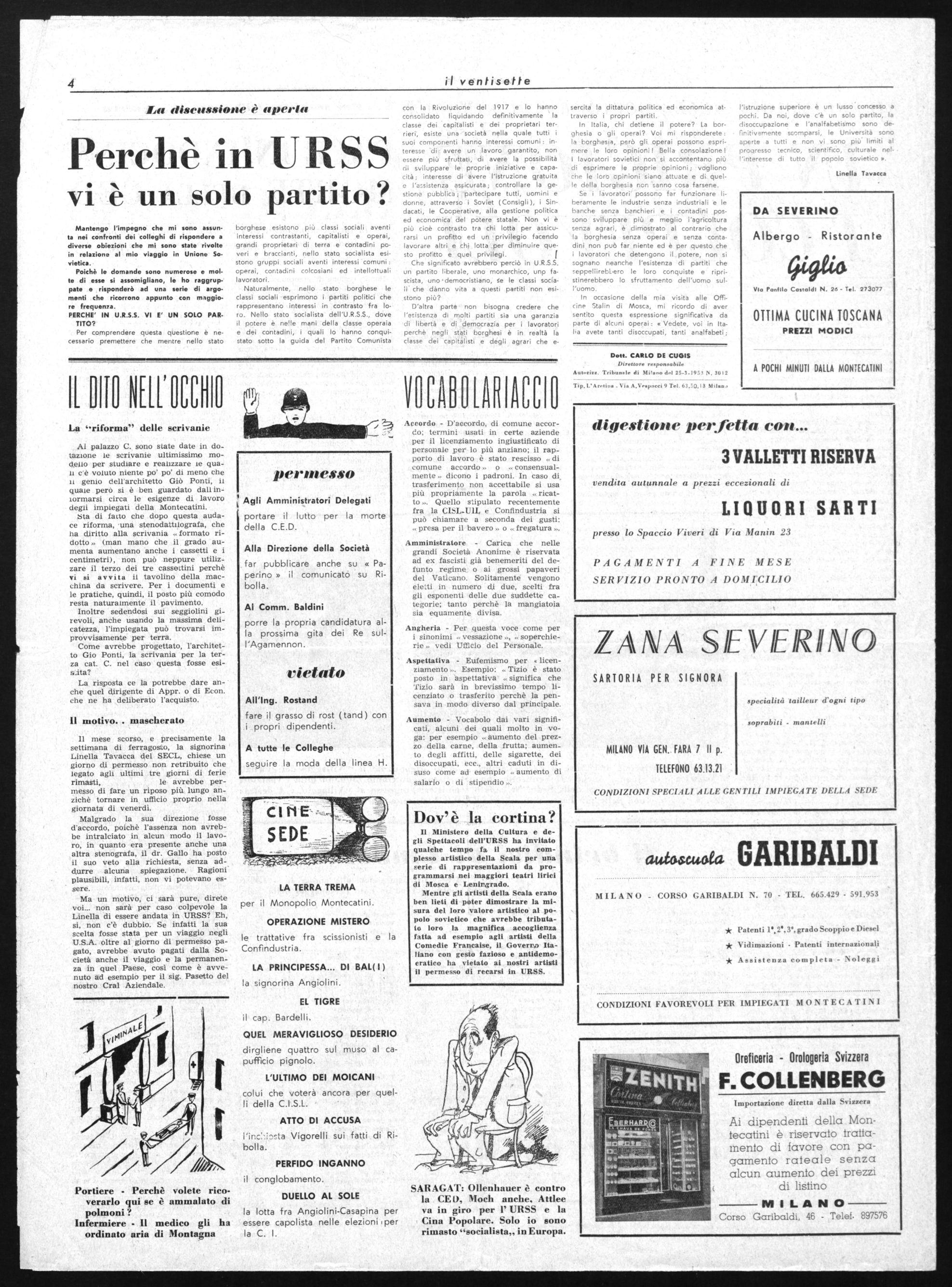 Ma un motivo, ci sarà pure, direte voi... non sarà per caso colpevole la Linella di essere andata in URSS? Eh, si, non c'è dubbio. Se infatti la sua scelta fosse stata per un viaggio negli U.S.A. oltre al giorno di permesso pagato, avrebbe avuto pagati dalla Società anche il viaggio e la permanenza in quel Paese, così come è avvenuto ad esempio per il sig. Pasetto del nostro Cral Aziendale.
