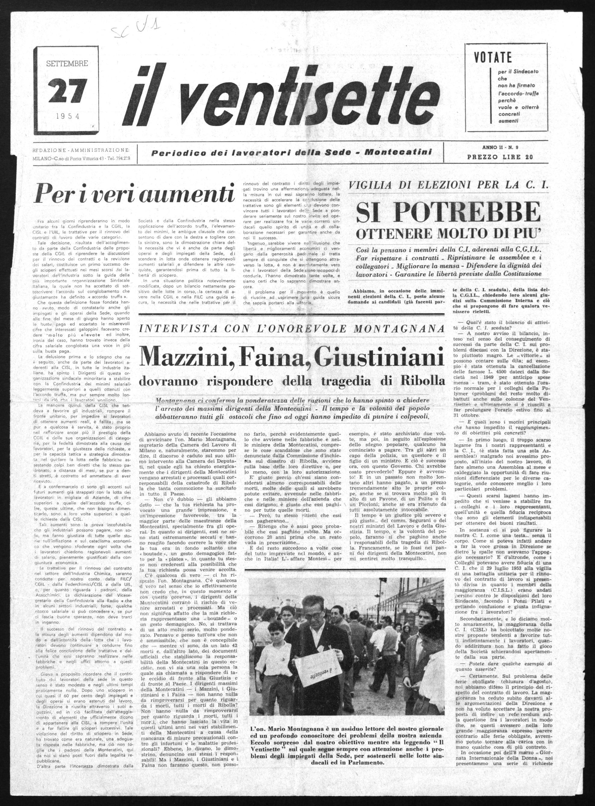 Giova a proposito ricordare che il contributo dei lavoratori della sede in questo senso è stato modesto e negli ultimi tempi praticamente nullo. Dopo uno sciopero in cui quasi il 60 per cento degli impiegati e degli operai si erano astenuti dal lavoro, la Direzione è riuscita attraverso i suoi aguzzini, ed in ciò facilitata dall'atteggiamento di elementi che ufficialmente dicono di appartenere alla CISL, a rompere l'unità e a far fallire gli scioperi successivi. Tale violazione del diritto di sciopero in Sede, ha trovato come era naturale, una adeguata risposta nelle fabbriche, ma ciò non toglie che i padroni della Montecatini, qui da noi si siano posti fuori dalla legalità repubblicana.