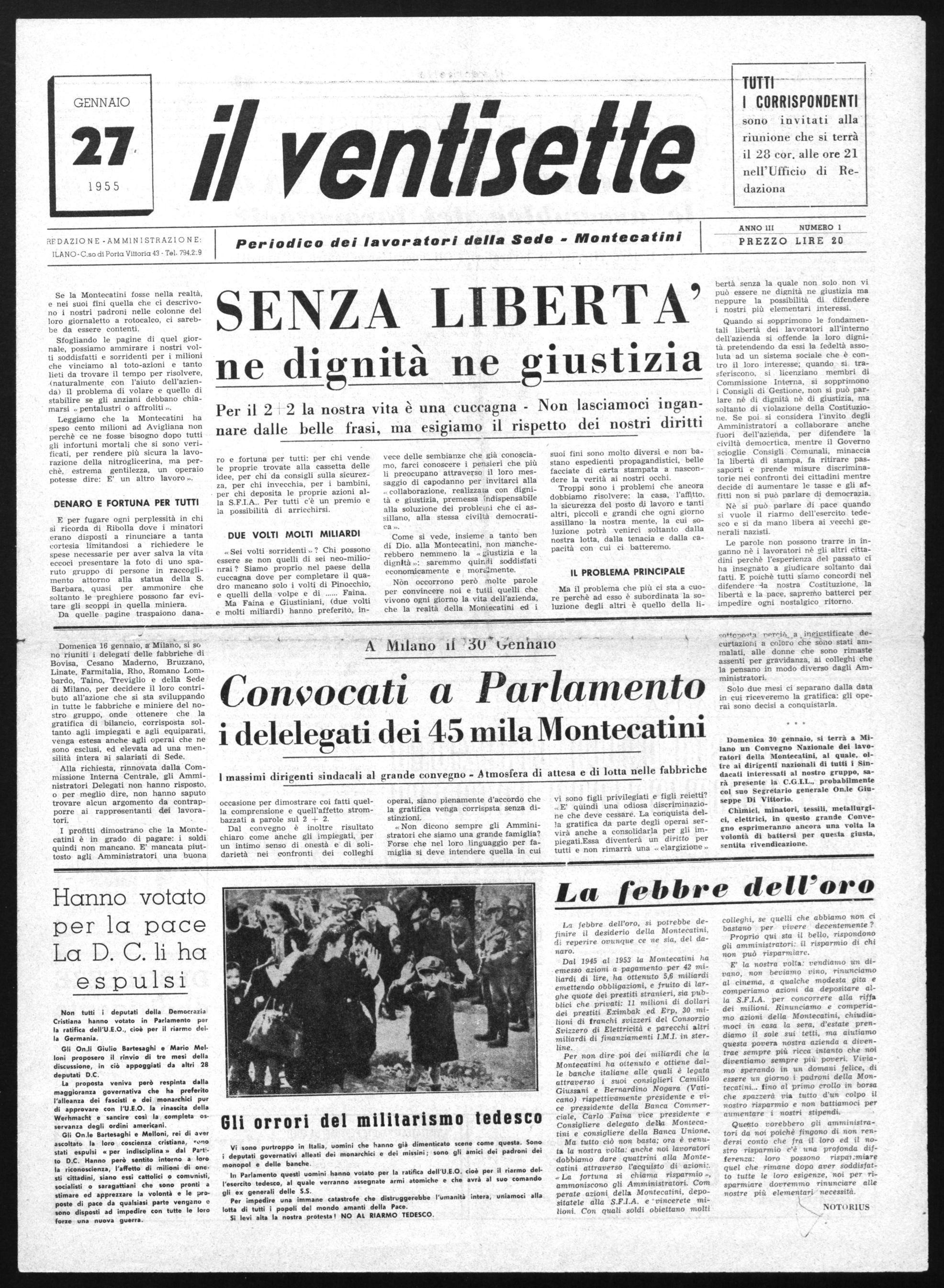 bertà senza la quale non solo non vi può essere ne dignità ne giustizia ma neppure la possibilità di difendere i nostri più elementari interessi. Quando si sopprimono le fondamentali libertà dei lavoratori all'interno dell'azienda si offende la loro dignità pretendendo da essi la fedeltà assoluta ad un sistema sociale che è contro il loro interesse; quando si trasferiscono, si licenziano membri di Commissione Interna, si sopprimono i Consigli di Gestione, non si può parlare nè di dignità nè di giustizia, ma soltanto di violazione della Costituzione. Se poi si considera l'invito degli Amministratori a collaborare anche fuori dell'azienda, per difendere la civiltà democrtica, mentre il Governo scioglie Consigli Comunali, minaccia la libertà di stampa, fa ritirare passaporti e prende misure discriminatorie nei confronti dei cittadini mentre decide di aumentare le tasse e gli affitti non si può parlare di democrazia. Nè si può parlare di pace quando si vuole il riarmo dell'esercito tedesco e si da mano libera ai vecchi generali nazisti.