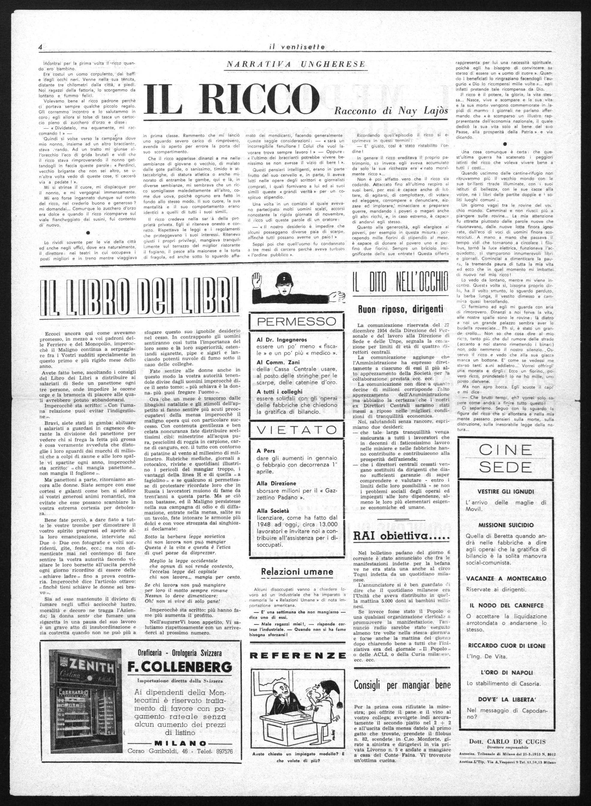 Ora 'che un mese è trascorso dalle libagiOni natalizie e gli stimoli dell'appetito si fanno sentire più acuti preoccupatevi della mensa imperocchè il maligno opera qui con particolare successo. Con contenuta gentilezza e ben celata noncuranza fate distribuire sceltissimi cibi: minestrine all'acqua pura, pesciolini di roggia in carpione, carne di canguro, ecc. il tutto con contorno di patatine al vento al millesimo di millimetro. Rubriche mediche, giornali a rotocalco, riviste e quotidiani illustrino i pericoli del mangiar troppo, i vantaggi della linea H e di quella « a fagiolino » e se qualcuno si permettesse di protestare ricordate loro che in Russia i lavoratori muiono di fame da trent'anni a questa parte. Ma se ciò non bastasse, ed il Maligno persistesse nella sua campagna di odio e di diffamazione, entrate nella mensa, salite su un tavolo, fate intonare le armonie più dolci e con voce strozzata dai singhiozzi declamate: