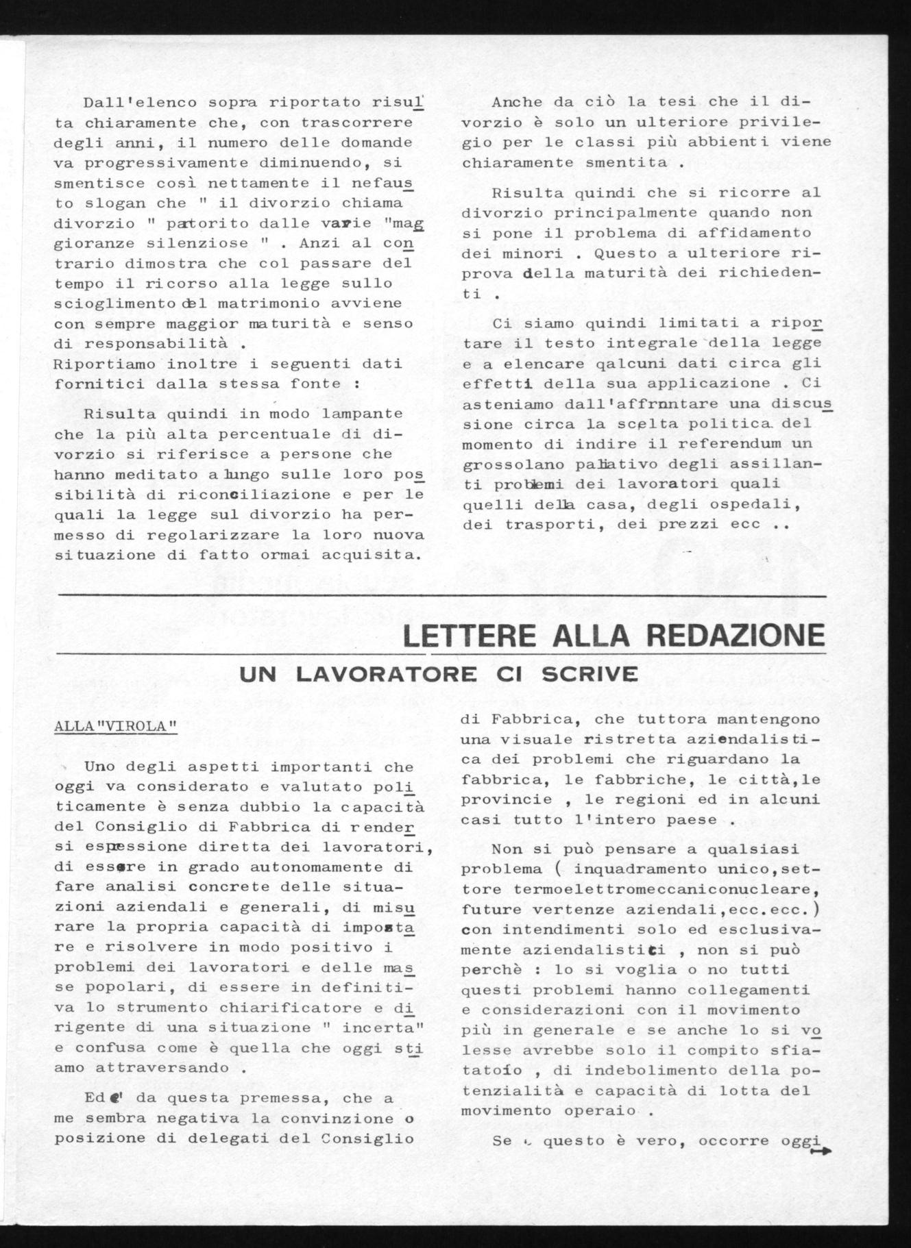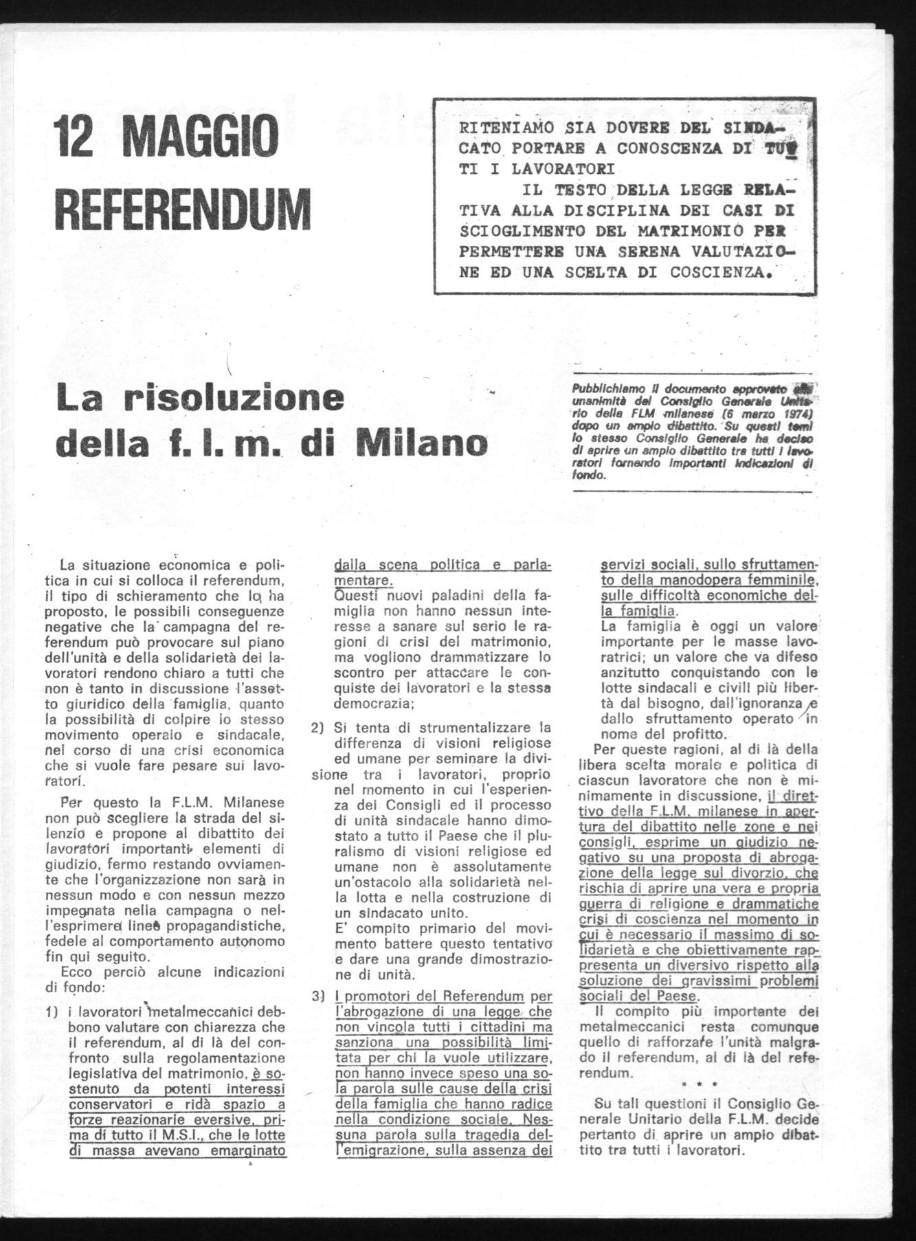 Per queste ragioni, al di là della libera scelta morale e politica di ciascun lavoratore che non è minimamente in discussione, direttivo della F.L.M. milanese in apertura del dibattito nelle zone e nei consigli, esprime un giudizio negativo su una proposta di abrogazione della legge sul divorzio, che rischia di aprire una vera e propria guerra di religione e drammatiche crisi di coscienza nel momento in necessario il massimo di solidarietà e che obiettivamente rappresenta un diversivo rispetto alla soluzione dei gravissimi problemi sociali del Paese.
