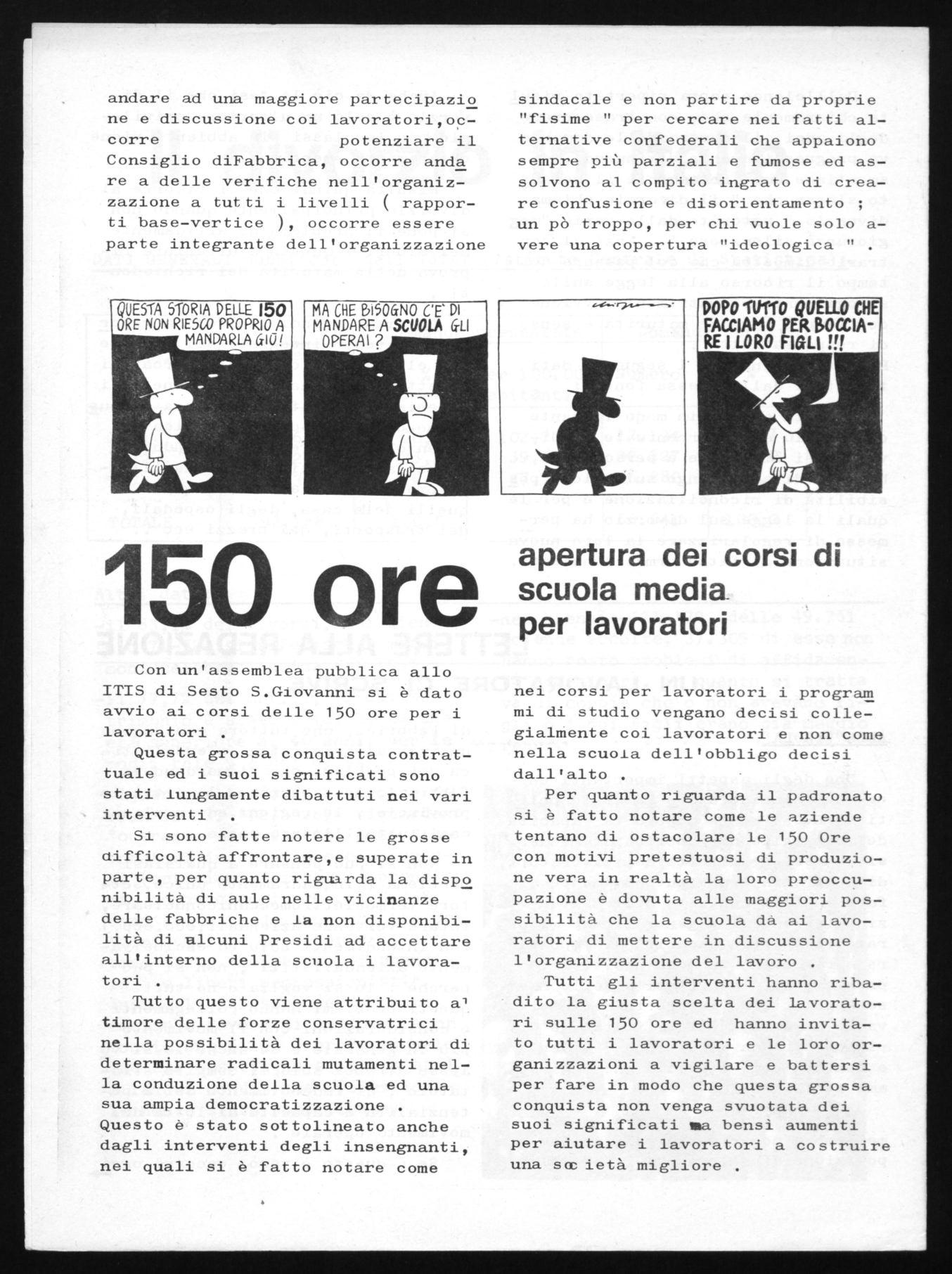 Per quanto riguarda il padronato si è fatto notare come le aziende tentano di ostacolare le 150 Ore con motivi pretestuosi di produzione vera in realtà la loro preoccupazione è dovuta alle maggiori possibilità che la scuola dà ai lavoratori di mettere in discussione l'organizzazione del lavoro .