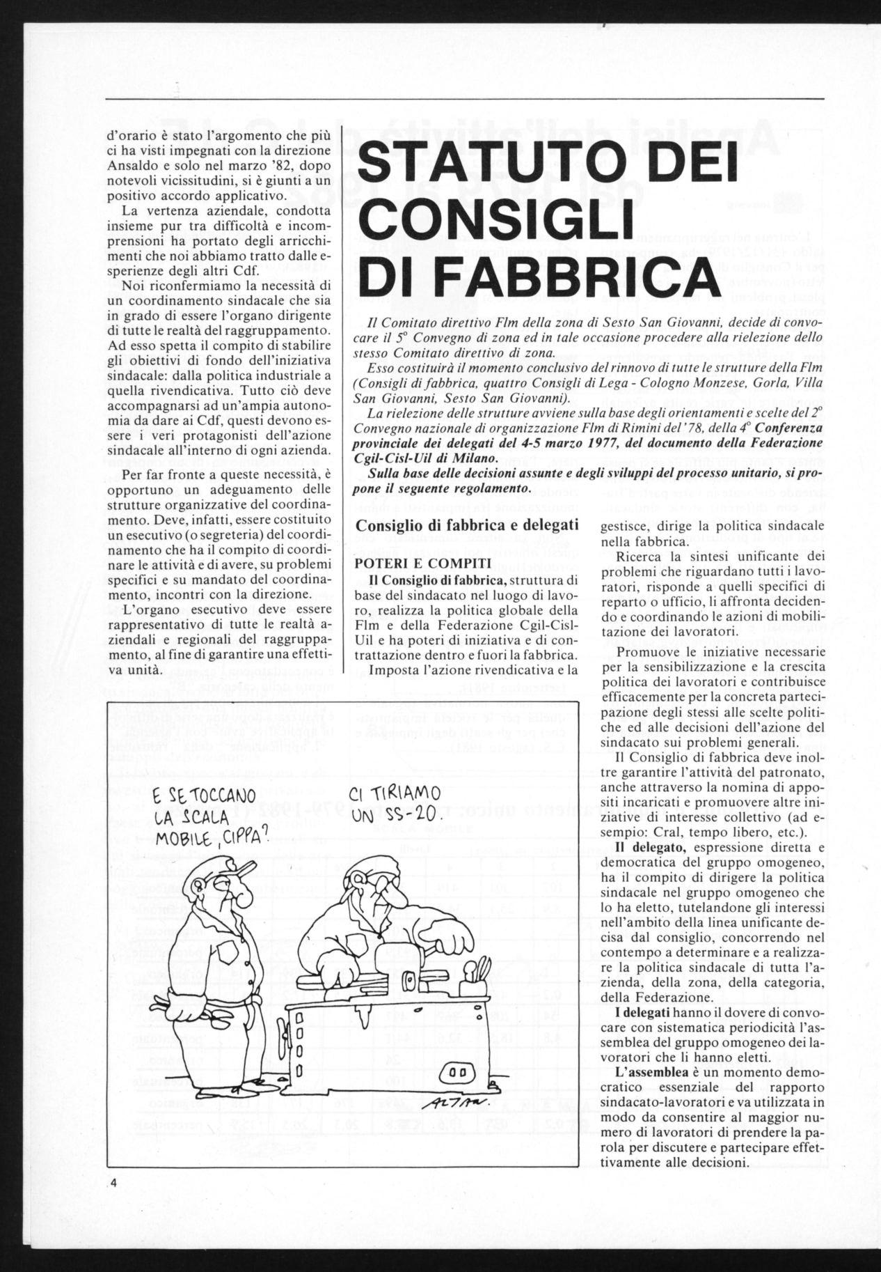 Il Consiglio di fabbrica,struttura di base del sindacato nel luogo di lavoro, realizza la politica globale della Flm e della Federazione Cgil-CislUil e ha poteri di iniziativa e di contrattazione dentro e fuori la fabbrica.