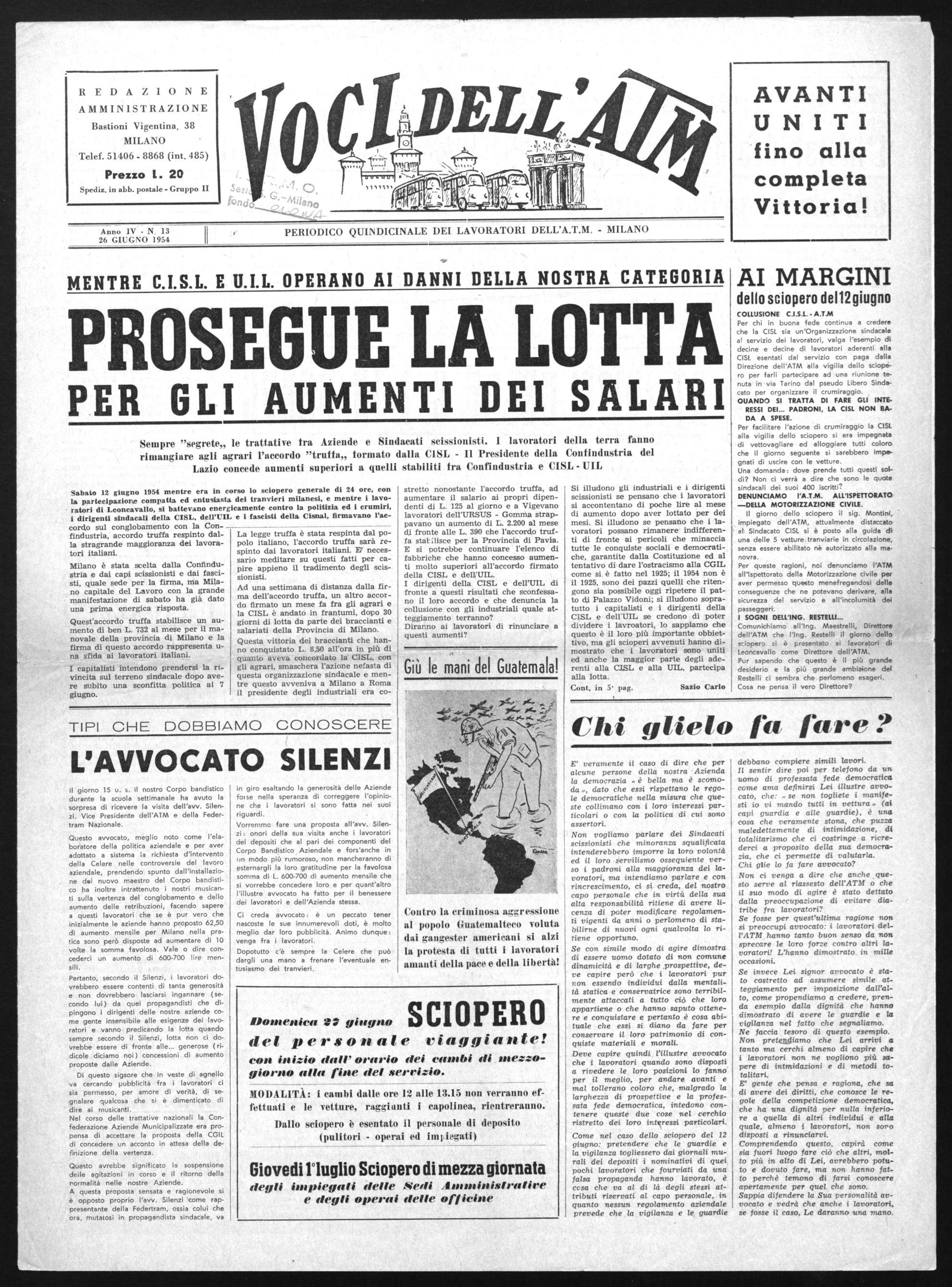 Sabato 12 giugno 1954 mentre era in corso lo sciopero generale di 24 ore, con la partecipazione compatta ed entusiasta dei tranvieri milanesi, e mentre i lavoratori di Leoncavallo, si battevano energicamente contro la politizia ed i crumiri, i dirigenti sindacali della CISL. dell'UIL e i fascisti della Cisnal, firmavano l'accordo sul conglobamento con la Confindustria, accordo truffa respinto dal- La legge truffa è stata respinta dal pola stragrande maggioranza dei lavora- polo italiano, l'accordo truffa sarà retori italiani. spinto dai lavoratori italiani. FI necessario meditare su questi fatti per capire appieno il tradimento degli scissionisti.