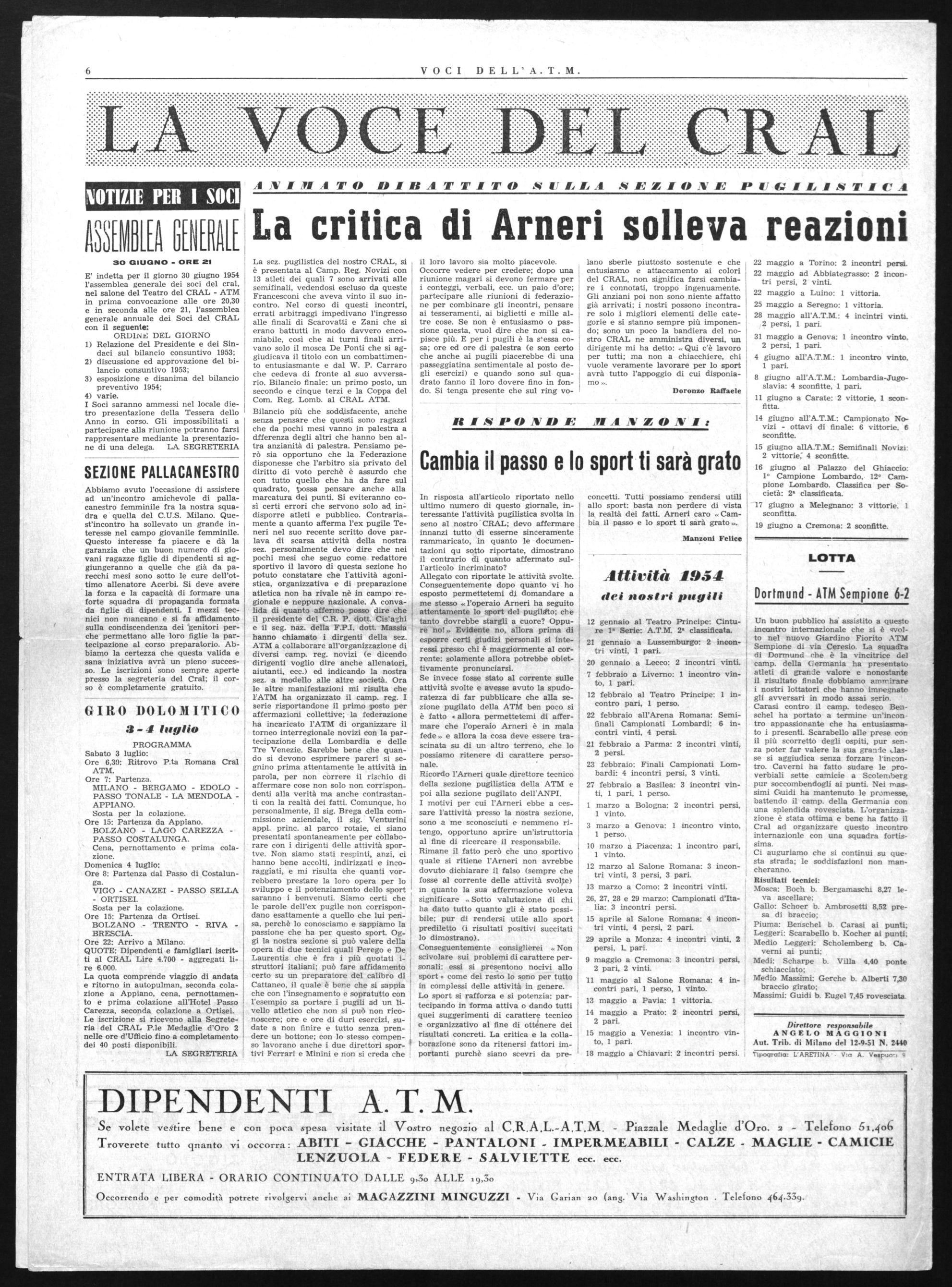E' indetta per il giorno 30 giugno 1954 l'assemblea generale dei soci del cral, nel salone del Teatro del CRAL - ATM in prima convocazione alle ore 20,30 e in seconda alle ore 21, l'assemblea generale annuale dei Soci del CRAL con il seguente: ORDINE; DEL GIORNO