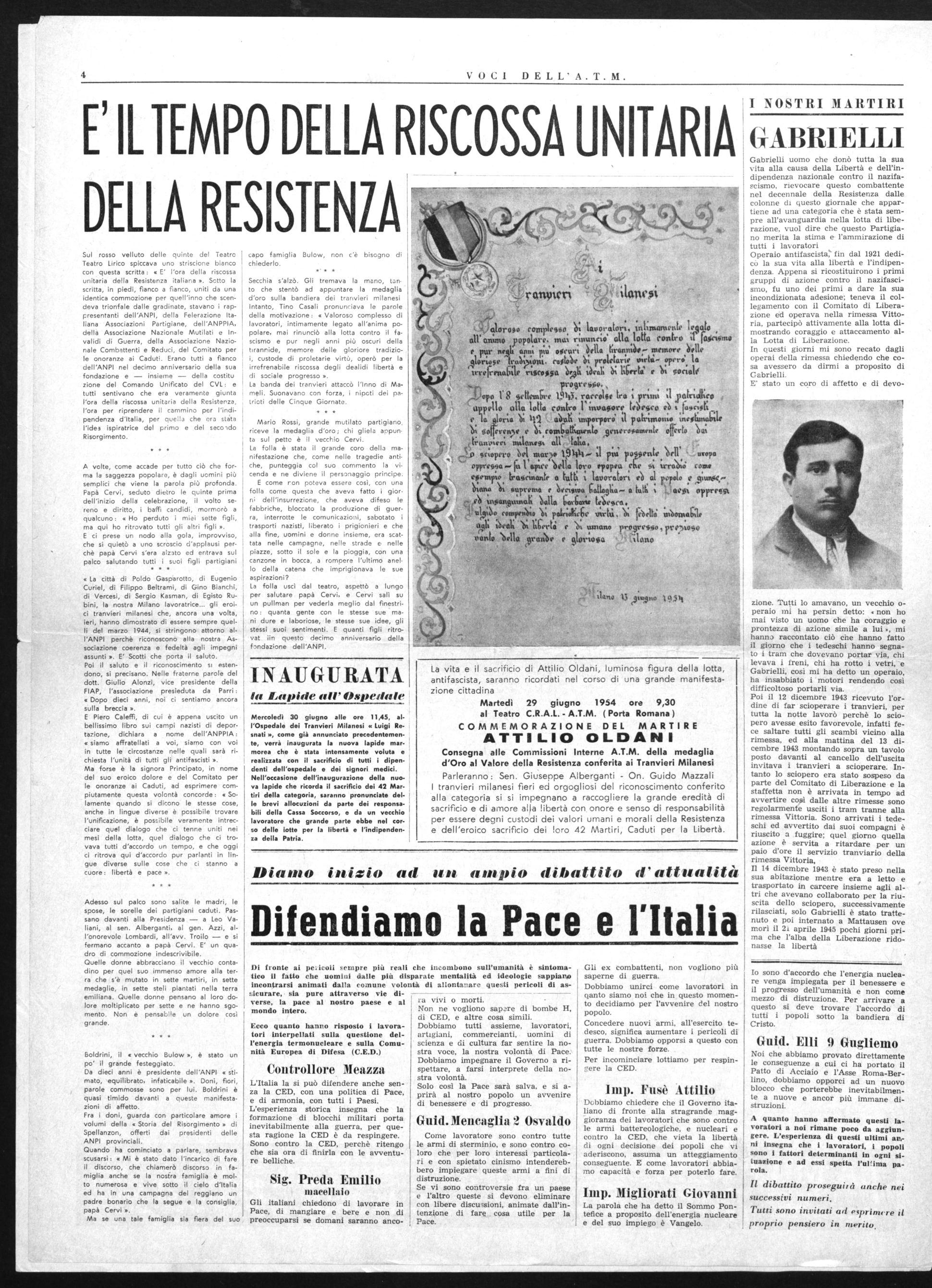 All'unanimità la C.I.A. ha deciso di intervenire al completo per ricevere in consegna la massima ricompensa al valore conferita alla categoria. Si fa appello a tutte le C. I. perchè mobilitino tutti i lavoratori ad intervenire numerosi alla manifestazione che avrà luogo martedì 29 giugno al Cral A.T.M.