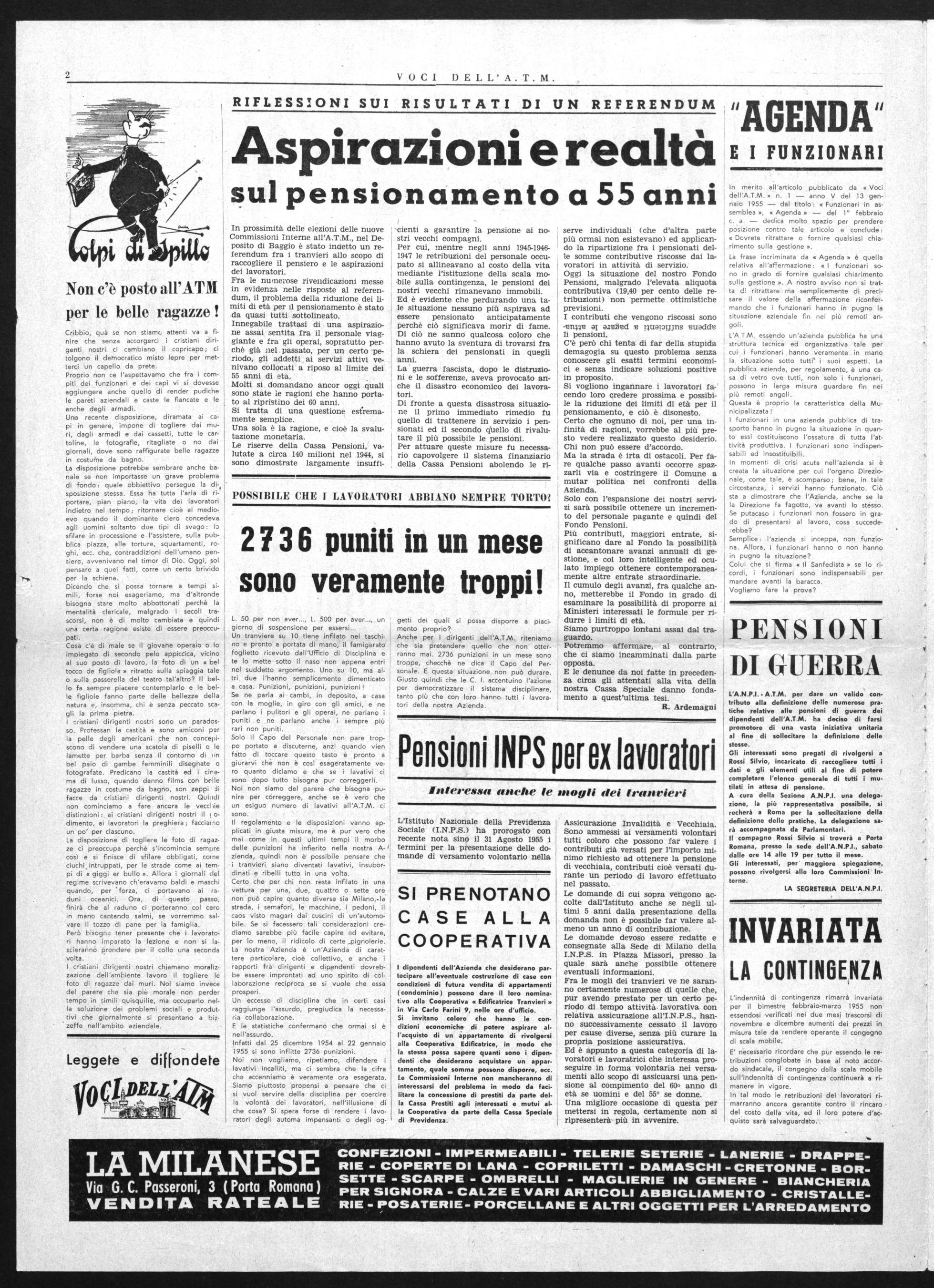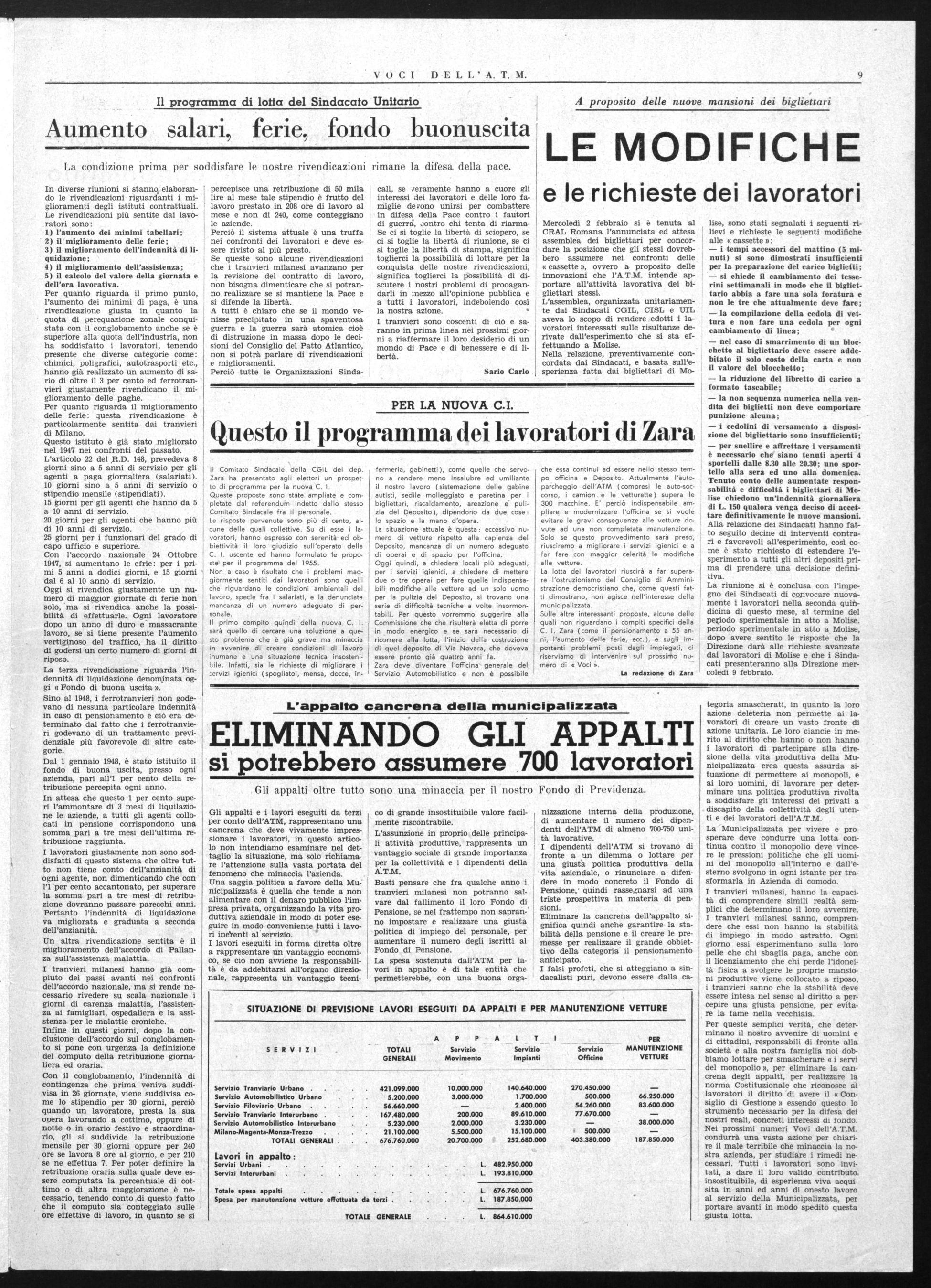 Ma la considerazione maggiore sarà fatta nei confronti della attuale Direzione ed Amministrazione dell'ATM. Di quante cose si ricorderanno gli impiegati, gli operai e il personale viaggiante in quella giornata e nel chiuso della cabina elettorale I Ricorderemo il disprezzo col quale ci accolsero più volte_quando si andava a far presente le nostre condizioni, ricorderemo le lunghe file davanti all'Ufficio Disciplina, penseremo a tutti i lavoratori pensionati anticipatamente alle tante promozioni mancate, agli appalti che come un sottile veleno già comincia a soffocarci, riandremo col pensiero alle percorrenze, alla vertenza della portiera aperta a tutta la politica deficitaria dl quest'anno' alla politica di discriminazione contro i lavoratori singoli e contro gli Organismi Aziendali.