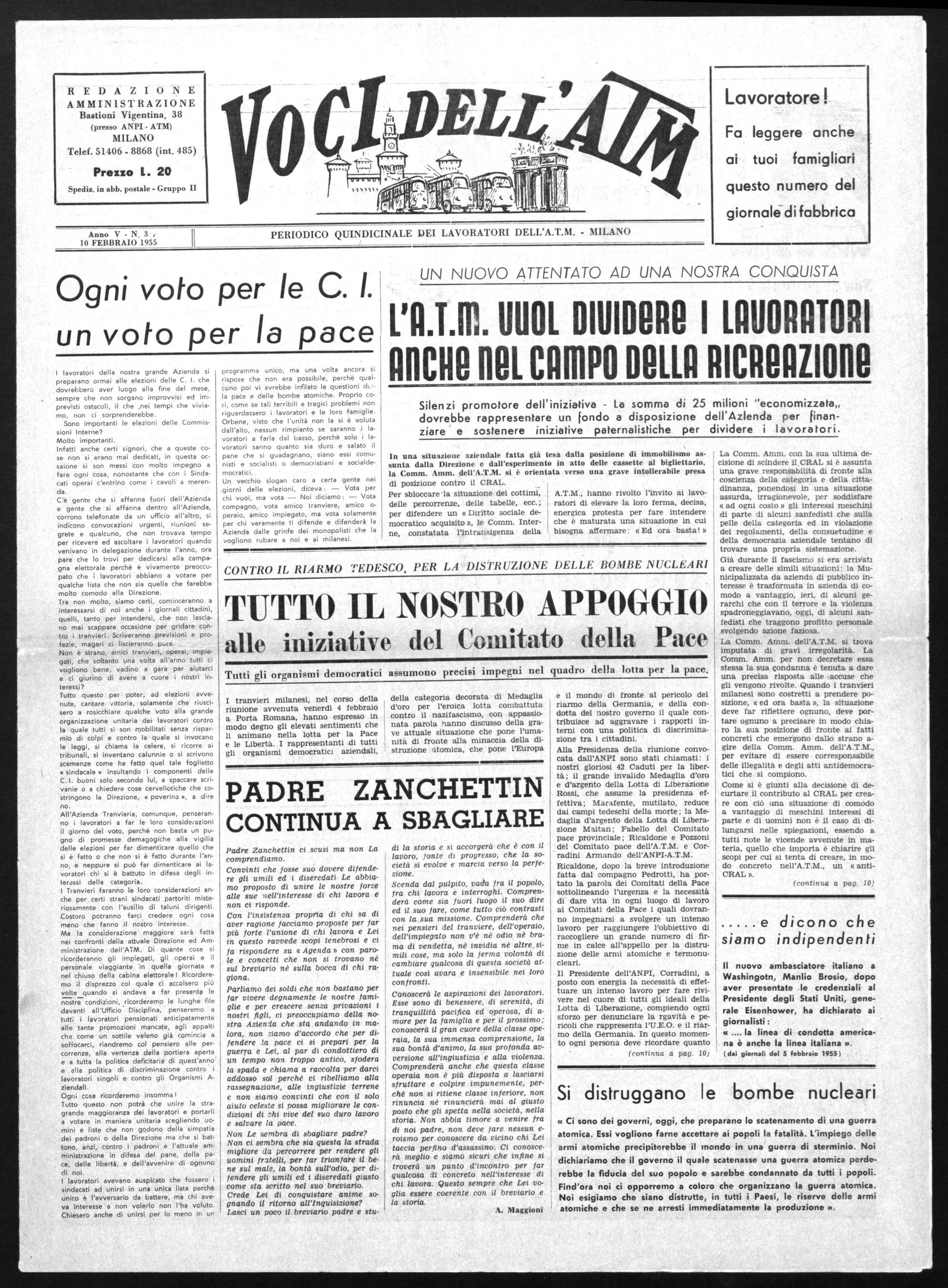 PERIODICO QUINDICINALE DEI LAVORATORI DELL'A.T.M. - MILANO Anno V - N. 3 10 FEBBRAIO 1955 R E D A ZIOSE AMMINISTRAZIONE