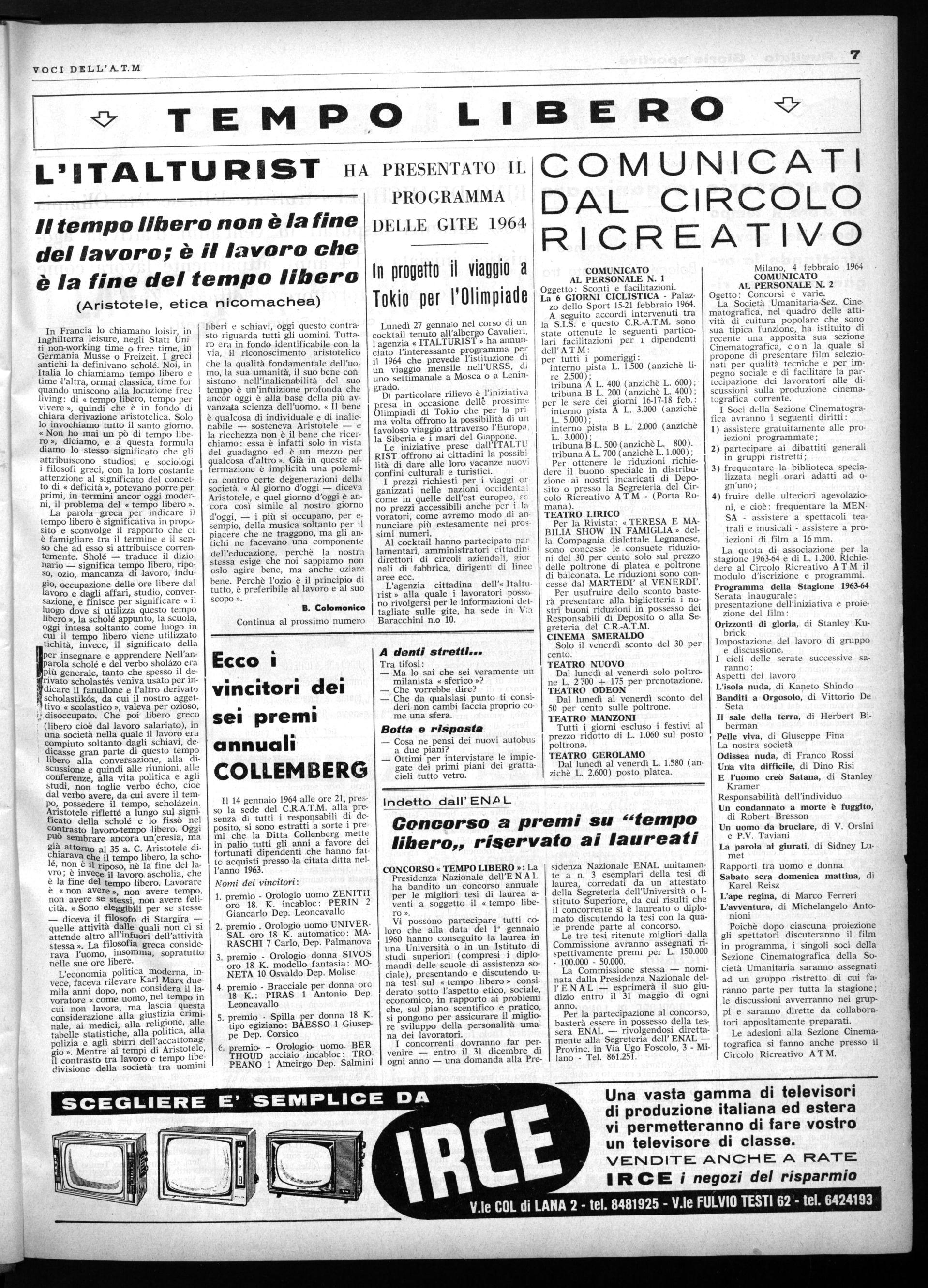 Una vasta gamma di televisori di produzione italiana ed estera vi permetteranno di fare vostro un televisore di classe. VENDITE ANCHE A RATE IRCE i negozi del risparmio Vie COL di LANA 2 - tel. 8481925 - V.le FULVIO TESTI 62 - te!. 6424193 VOCI DELL'A.T.M