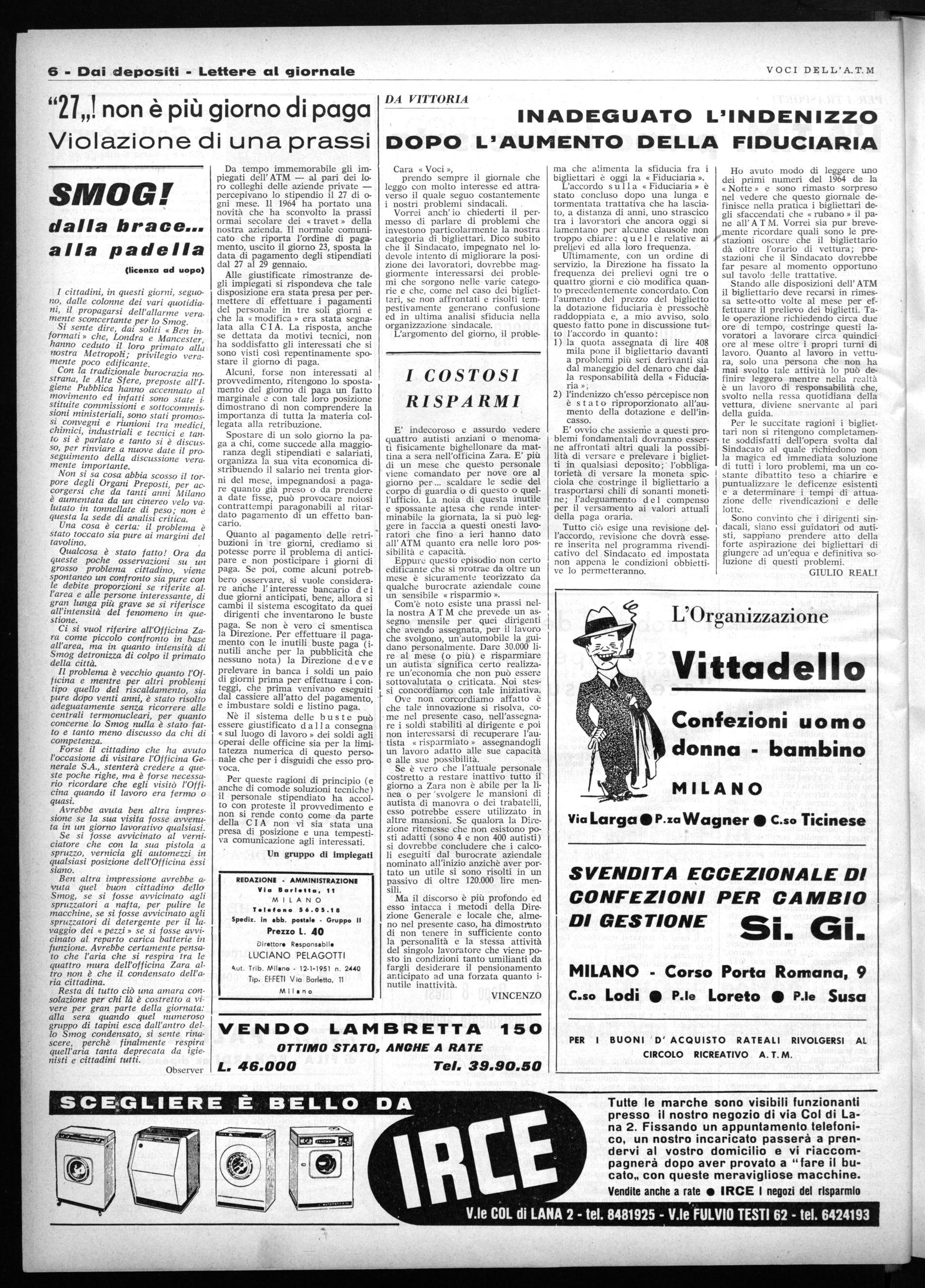 Assurdo ci sembra oggi dover scrivere ripetutamente delle libertà nelle fabbriche; sembra uno sproposito che con un governo di Centro Sinistra nato dalla volontà di democrazia del popolo, si debba sottolineare la ristrettezza •del concetto di libertà che hanno i dirigenti di una azienda pubblica qual'è I'A.T.M.. Proprio i tranvieri, è bene ricordarlo, si sono eroicamente battuti venti anni fa per conquistare la piena libertà per tutti i cittadini. Il nuovo spirito creato dalla vittoria sulla dittatura aveva istaurato un clima nuovo di rapporti che rispecchiava l'unanime consenso e rinnova l'ambiente rendendolo più democratico e confacente alla nostra economia. Il lavoro procedeva in armonia e finalmente tutti avevano il diritto di cittadinanza nei luoghi di lavoro ove potevano esprimere le loro idee. Per pochi anni si andò avanti così ma poi i padroni pensarono di restringere queste libertà per tema che i lavoratori imparassero troppo che le idee liberamente espresse si tramutassero in movimenti organizzati che potessero condizionare il loro dominio economico e politico. Con l'uscita dei partiti dei lavoratori dal governo, ebbe inizio in tutto il paese una campagna di odio di divisione accompagnata da soventi conflitti fra lavoratori e la pohzia di Scelba. La nostra Direzione non tardò ad allinearsi a questo clima nonostante l'opposizione della nostra forte e combattiva categoria; così si giunse ad abolire gli albi murali politici, ad impedire riunioni, a bandire