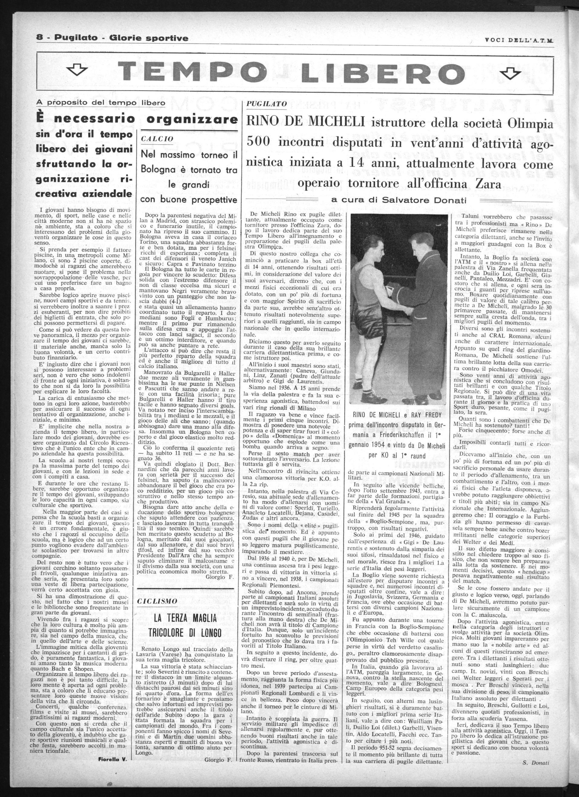 De Micheli Rino ex pugile dilettante, attualmente occupato come tornitore presso l'officina Zara, dopo il lavoro dedica parte del suo Tempo Libero all'insegnamento e preparazione dei pugili della palestra Olimpica.