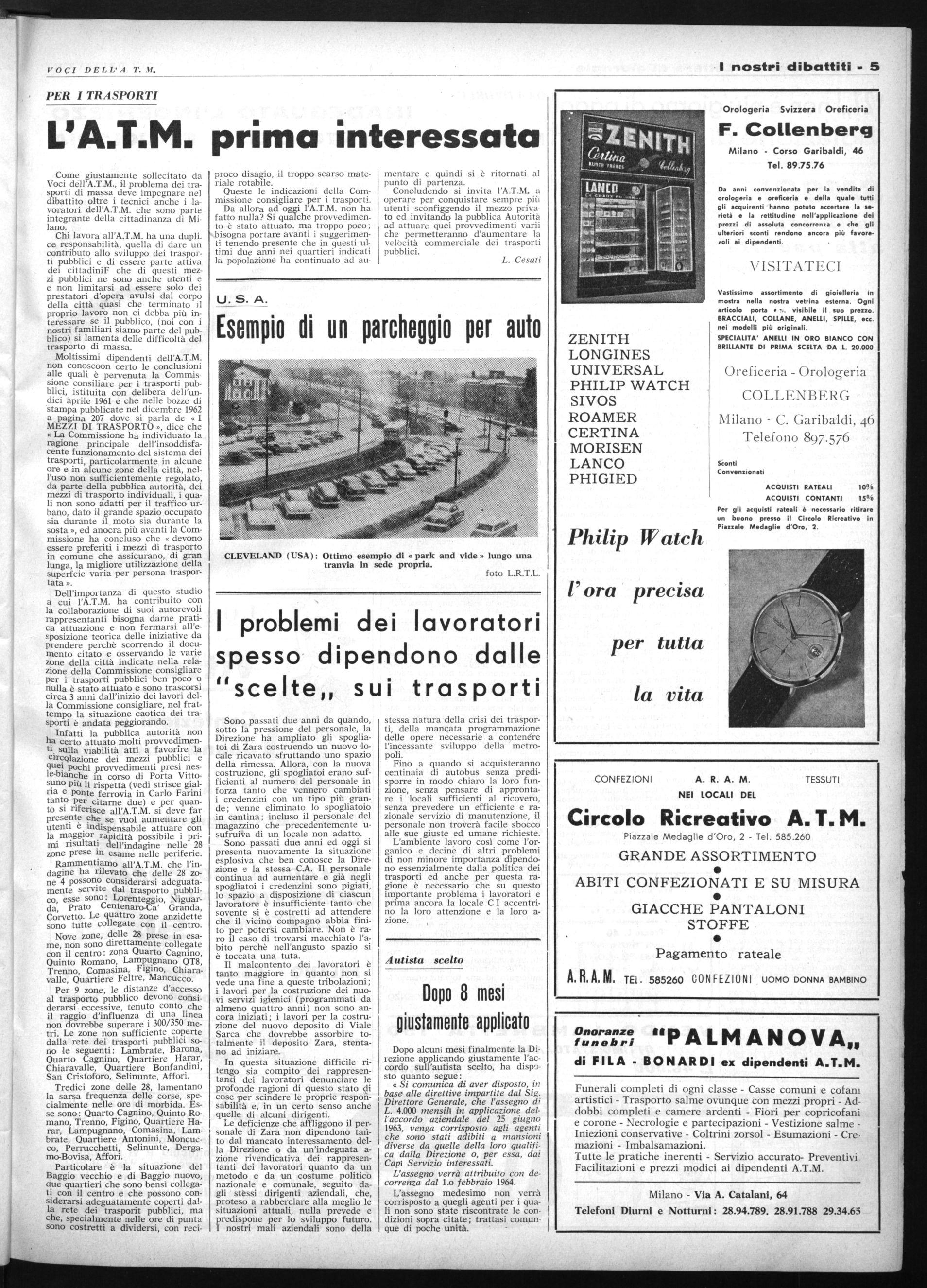 mentare e quindi si è ritornati al punto di partenza. Concludendo si invita l'A.T.M. a operare per conquistare sempre più utenti scònfiggendo il mezzo privato ed invitando la pubblica Autorità ad attuare quei provvedimenti vani che permetteranno d'aumentare la velocità commerciale dei trasporti pubblici.