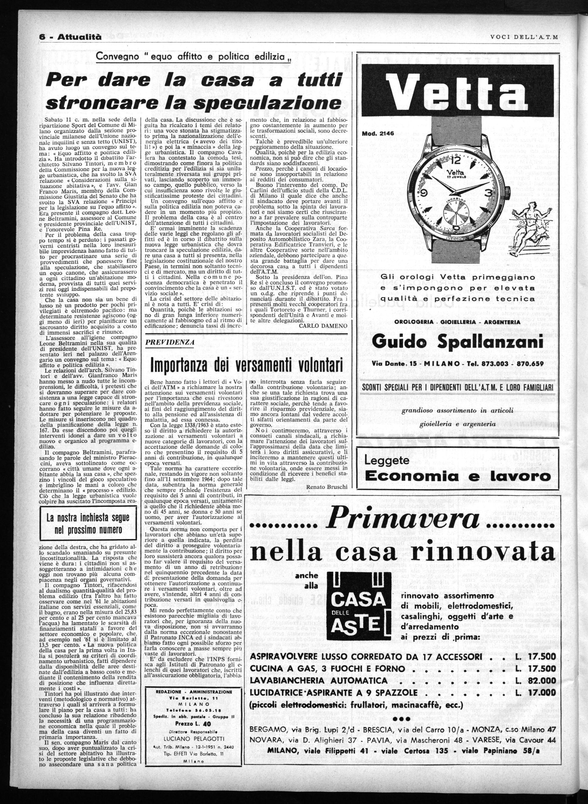 ne del lavoro verso i comuni ideali del socialismo. Per noi tranvieri la rassegna delle conquiste ottenute è lusinghiera. Nell'anno che ci divide dal maggio '63 abbiamo riportato importanti accordi nazionali quali quello sulla riduzione dell'orario di la-