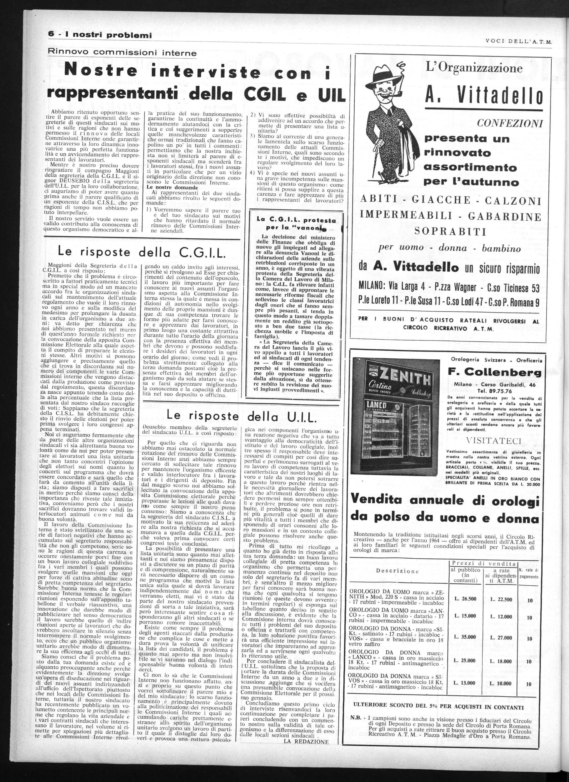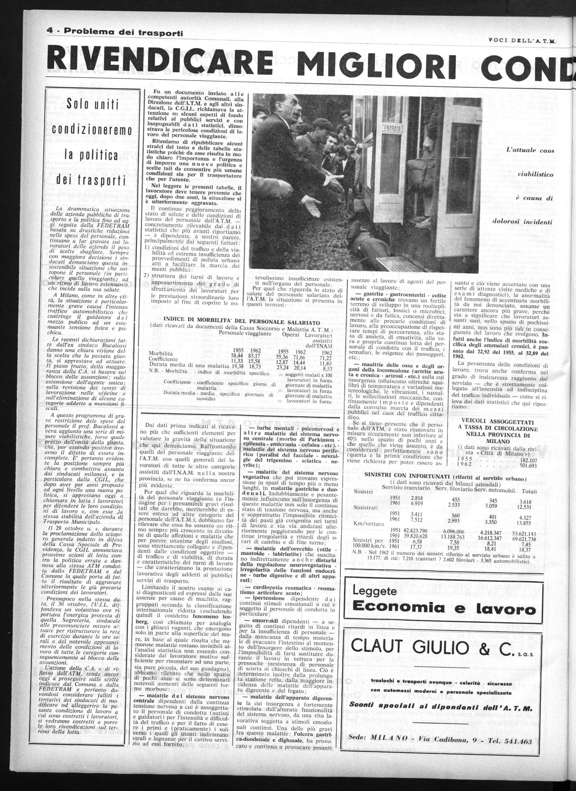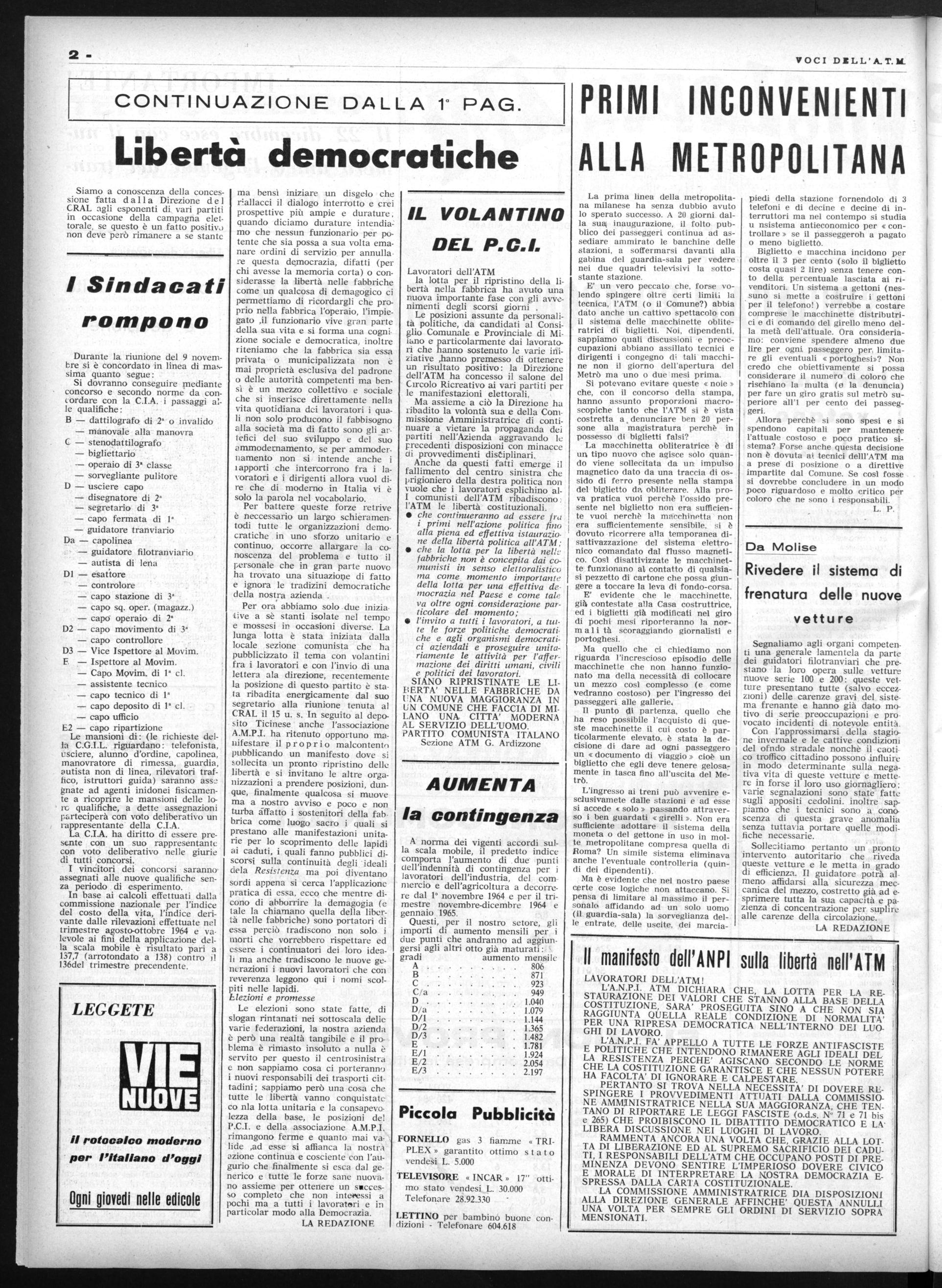 Anche da questi fatti emerge il fallimento del centro sinistra che prigioniero della destra politica non vuole che i lavoratori esplichino alI comunisti dell'ATM ribadiscono: l'ATM le libertà costituzionali. che continueranno ad essere fra i primi nell'azione politica fino alla piena ed effettiva istaurazione della libertà politica all'ATM; che la lotta per la libertà nelle fabbriche non è concepita dai comunisti in senso elettoralistico ma come, momento importante della lotta per una effettiva democrazia nel Paese e come tale va oltre ogni considerazione particolare del momento; l'invito a tutti i lavoratori, a utile le forze politiche democratiche e agli organismi democratici aziendali e proseguire unitariamente le attività per l'affermazione dei diritti umani, civili e politici dei lavoratori.