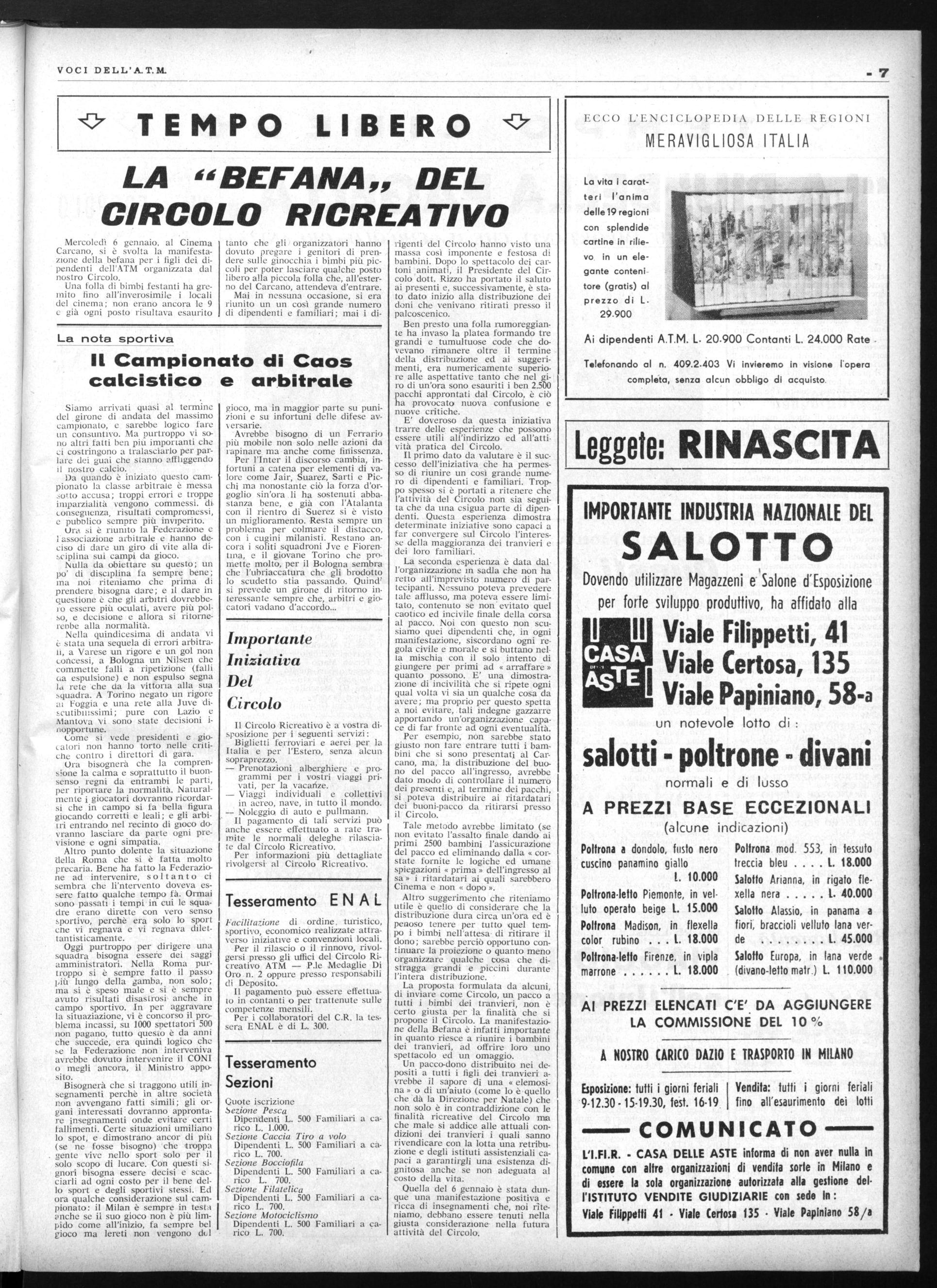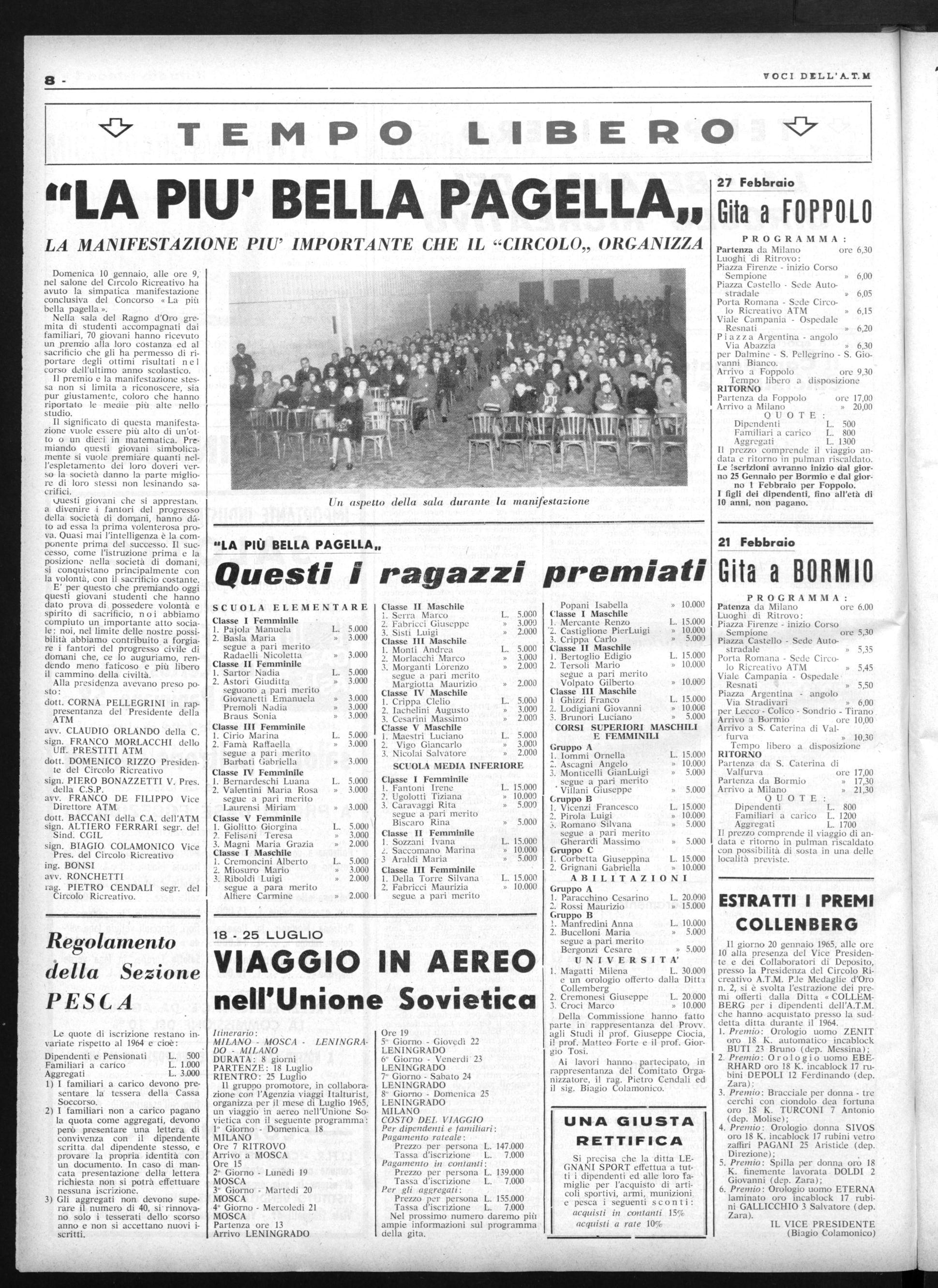 Il giorno 20 gennaio 1965, alle ore 10 alla presenza del Vice Presidente e dei Collaboratori di Deposito, presso la Presidenza del Circolo Ricreativo A.T.M. P.le Medaglie d'Oro n. 2, si è svolta l'estrazione dei premi offerti dalla Ditta « COLLEMBERG per i dipendenti dell'A.T.M. che hanno acquistato presso la suddetta ditta durante il 1964.