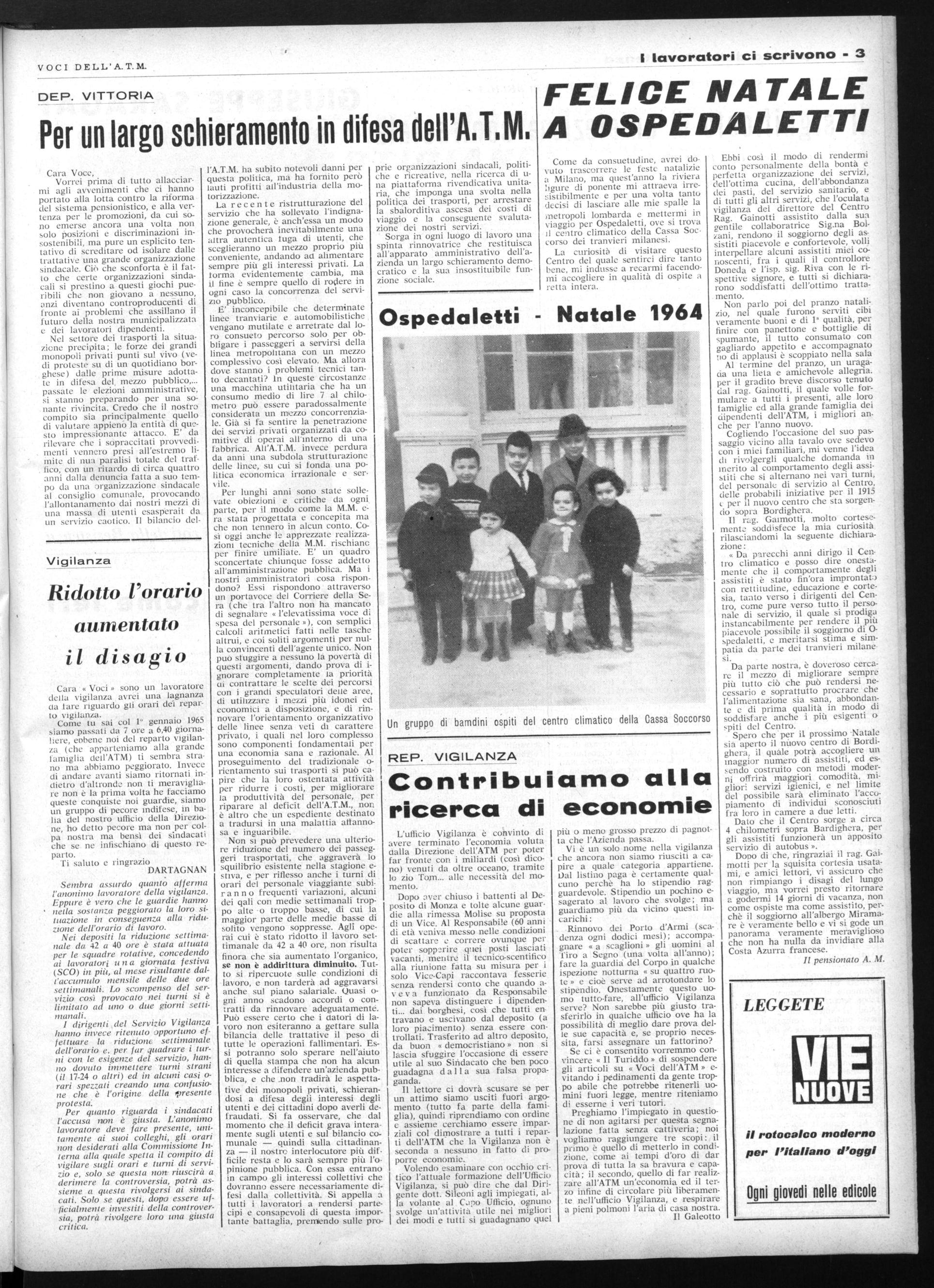 Si comunica a tutto il personale che, a partire dal giorno 4 gennaio 1965, per la distribuzione del vestiario in dotazione al personale, il Magazzino Vestiario osserverà il seguente orario: dal lunedì al venerdì