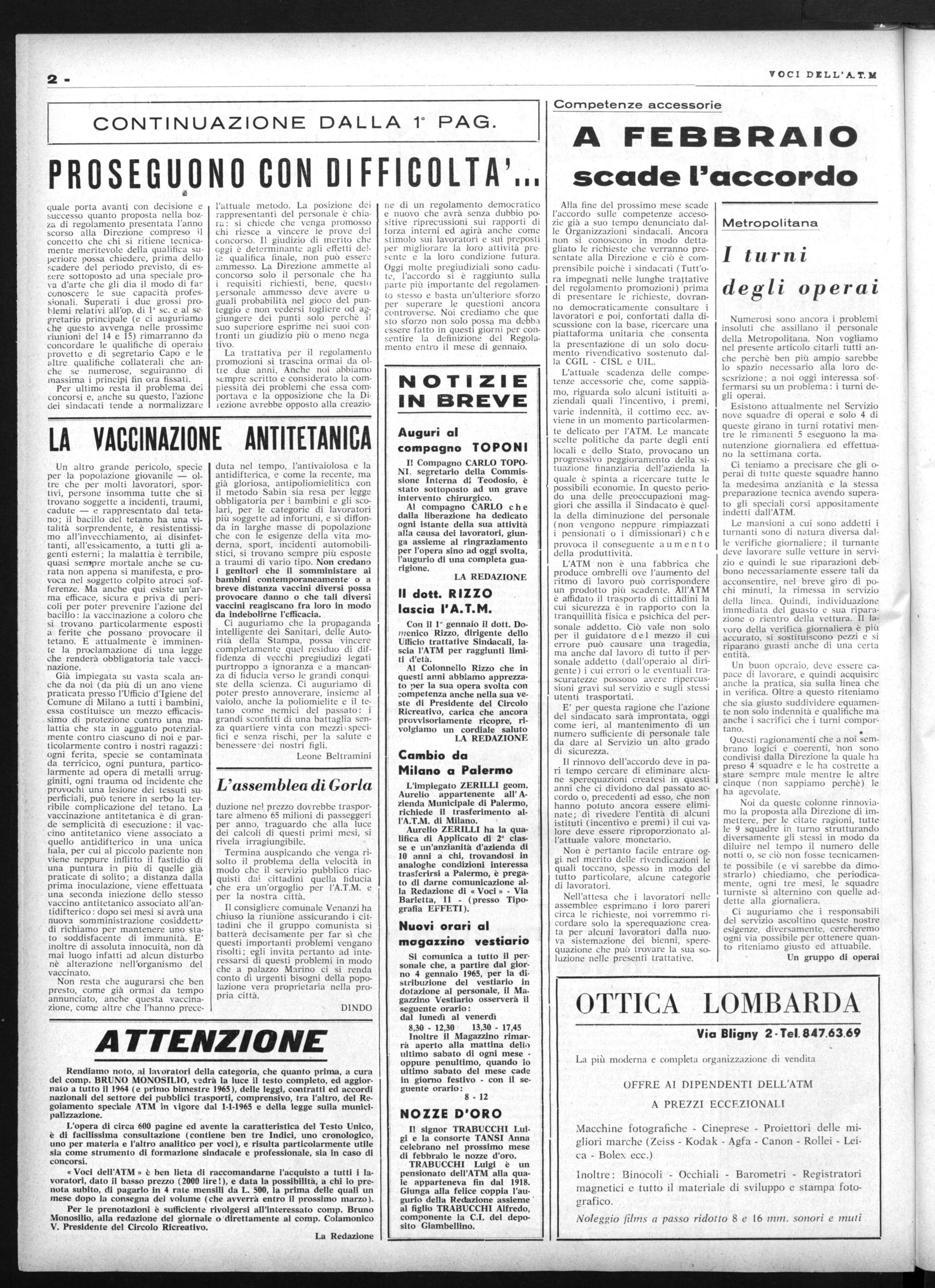 L'attuale scadenza delle competenze accessorie che, come sappiamo, riguarda solo alcuni istituiti aziendali quali l'incentivo, i premi, varie indennità, il cottimo ecc. avviene in un momento particolarmente delicato per l'ATM. Le mancate scelte politiche da parte degli enti locali e dello Stato, provocano un progressivo peggioramento della situazione finanziaria dell'azienda la quale è spinta a ricercare tutte le possibili economie. In questo periodo una delle preoccupazioni maggiori che assilla il Sindacato è quella della diminuzione del personale (non vengono neppure rimpiazzati i pensionati o i dimissionari) c h e provoca il conseguente aumento della produttività.