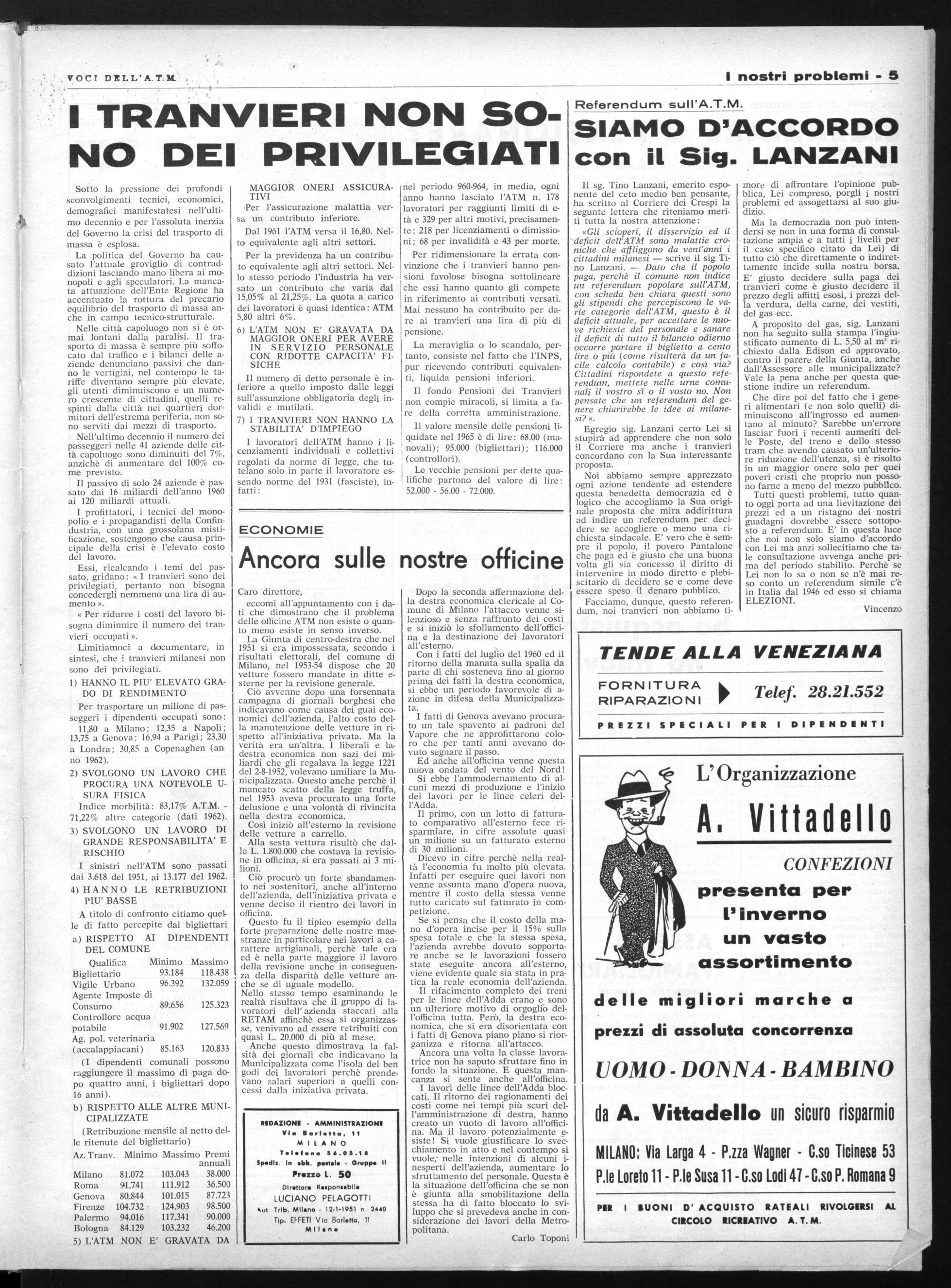 La situazione è difficile, la campagna di odio e di disinformazione portata avanti per mesi e mesi dalla stampa con il chiaro intento di scagliare l'opinione pubblica contro il tranviere ha dato i suoi frutti. Ciò dev'essere tenuto conto nelle dichiarazioni di lotte che danneggiando una larga massa di cittadini, potrebbero anche ricadere contro la categoria. Ma non bisogna neppure sopravalutare la forza dell'avversario. Sempre nuove voci, spesso autorevoli, si levano in difesa dei tranvieri e dell'ATM dimostrando con dati inconfutabili che il deficit non è dovuto al personale, che nulla si risolve con le economie o le mutilazioni.