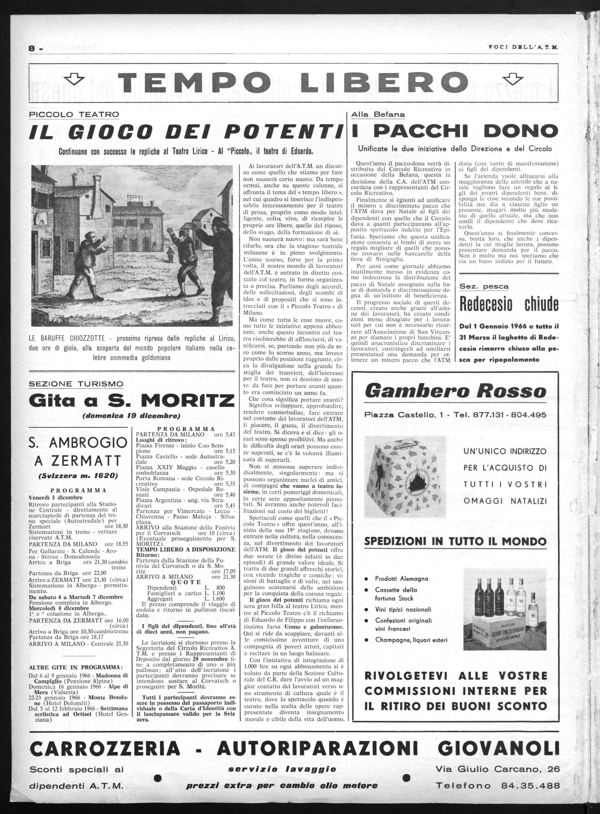 Ma come tutte le cose nuove, come tutte le iniziative appena abbozzate, anche questo incontro col teatro rischierebbe di afflosciarsi, di vanificarsi, se, partendo non più da zero come lo scorso anno, ma invece proprio dalle posizioni raggiunte, circa la divulgazione nella grande famiglia dei tranvieri, dell'interesse per il teatro, non ci dessimo di nuove da fare per portare avanti quanto era cominciato un anno fa. Che cosa significa portare avanti? Significa sviluppare, approfondire, rendere consuetudine, fare entrare nel costume dei lavoratori dell'ATM, il piacere, il gusto, il divertimento del teatro. Si diceva e si dice: gli orari sono spesso proibitivi. Ma anche le difficoltà degli orari possono essere superati, se c'è la volontà illuminata di superarli. Non si possono superare individualmente, singolarmente: ma si possono organizzare nuclei di amici, di compagni che vanno a teatro insieme, in certi pomeriggi domenicali, in certe sere appositamente prenotati. Si avranno anche notevoli facilitazioni sul costo dei biglietti ! Spettacoli come quelli che il « Piccolo Teatro » offre quest'anno, all'inizio della sua 19` stagione, devono entrare nella cultura, nella conoscenza, nel divertimento dei lavoratori dell'ATM. Il gioco dei potenti offre due serate (è diviso infatti in due episodi) di grande valore ideale. Si tratta di due grandi affreschi storici, con vicende tragiche e comiche : visioni di battaglie e di volte, nel sanguinoso scatenarsi delle ambizioni per la conquista della corona regale.