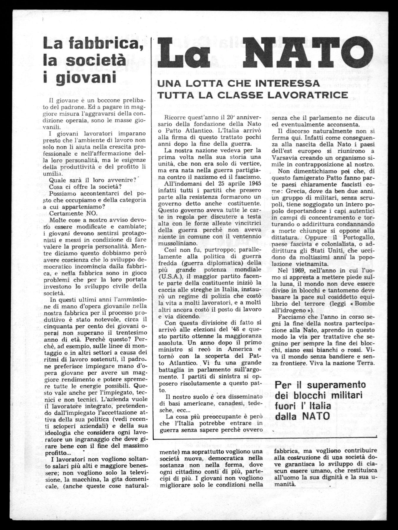 Il discorso naturalmente non si ferma qui. Infatti come conseguenza alla nascita della Nato i paesi dell'est europeo si riunirono a Varsavia creando un organismo simile in contrapposizione al nostro. . Non dimentichiamo poi che, di questo famigerato Patto fanno parte paesi chiaramente fascisti come: Grecia, dove da ben due anni, ún gruppo di militari, senza scrupoli, tiene soggiogato un intero popolo deportandone i capi autentici in campi di concentramento e torturando o addirittura condannando a morte chiunque si oppone alla dittatura. Oppure il Portogallo, paese fascista e colonialista, o addirittura gli Stati Uniti, che uccidono da moltissimi anni la popolazione vietnamita.