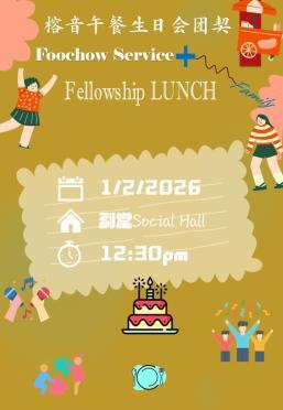 为鼓励弟兄姐妹彼此关怀、互相扶持,并更积极融入 教会生活,榕语崇拜将于 2 月 1 日主日崇拜结束后, 在副堂举行午餐聚会暨生日庆祝会。