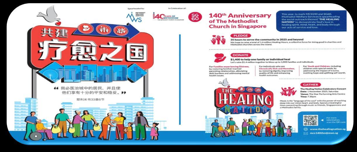 弟兄姐妹,让我们携手共建 “疗愈之国 The Healing Nation”,庆祝新 加坡卫理公会创立140周年与新加坡建国60周年。透过服务与关怀, 我们以实际行动彰显上帝的爱。请浏览 www.thehealingnation.sg 了解 如何响应 “疗愈之国”,积极参与社会关怀与外展事工,成为社区的 祝福。