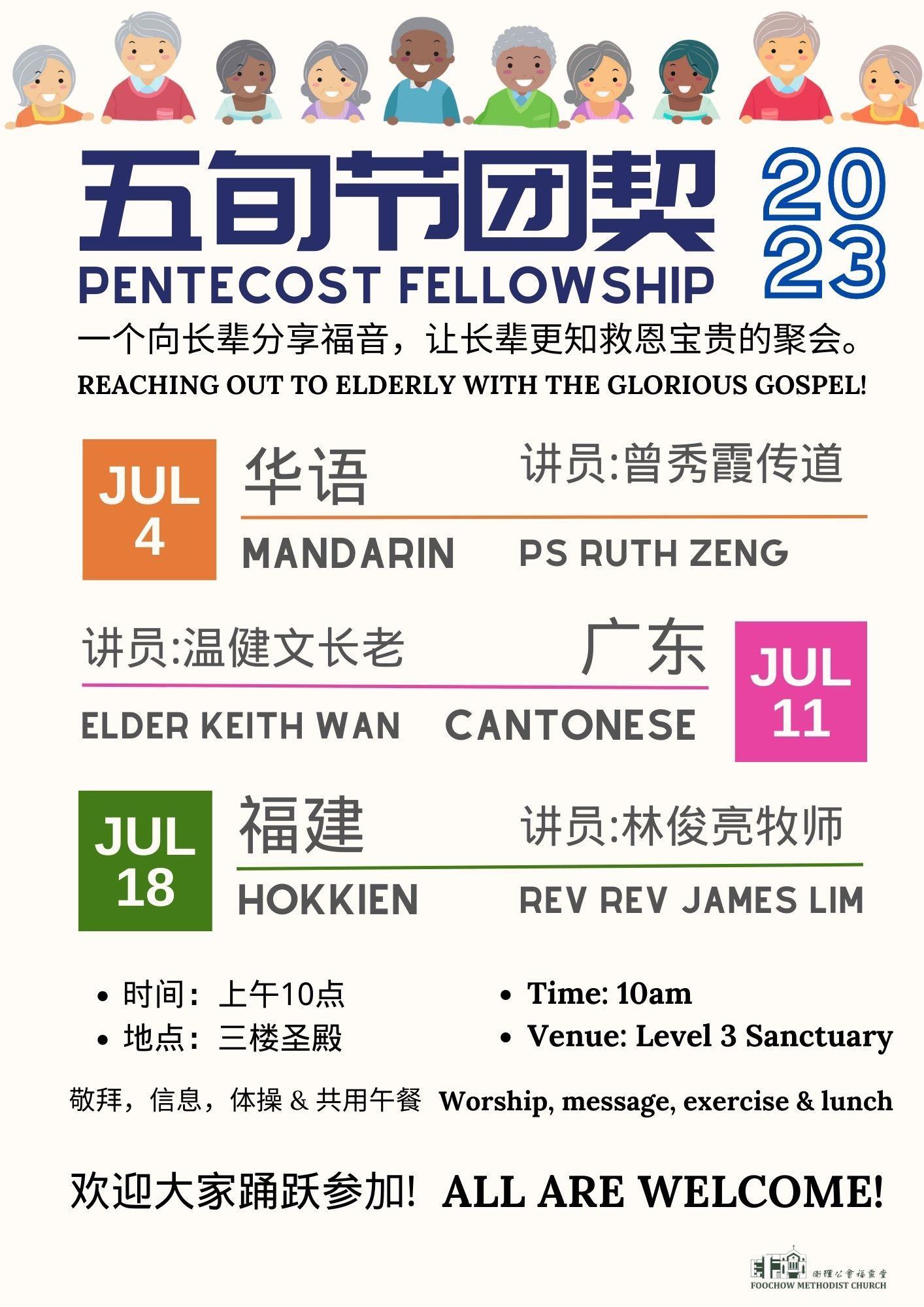 3. 五旬节团契-华语 日期:7月4日(周二) 时间:上午10时 地点:三楼圣殿 讲员:曾秀霞传道