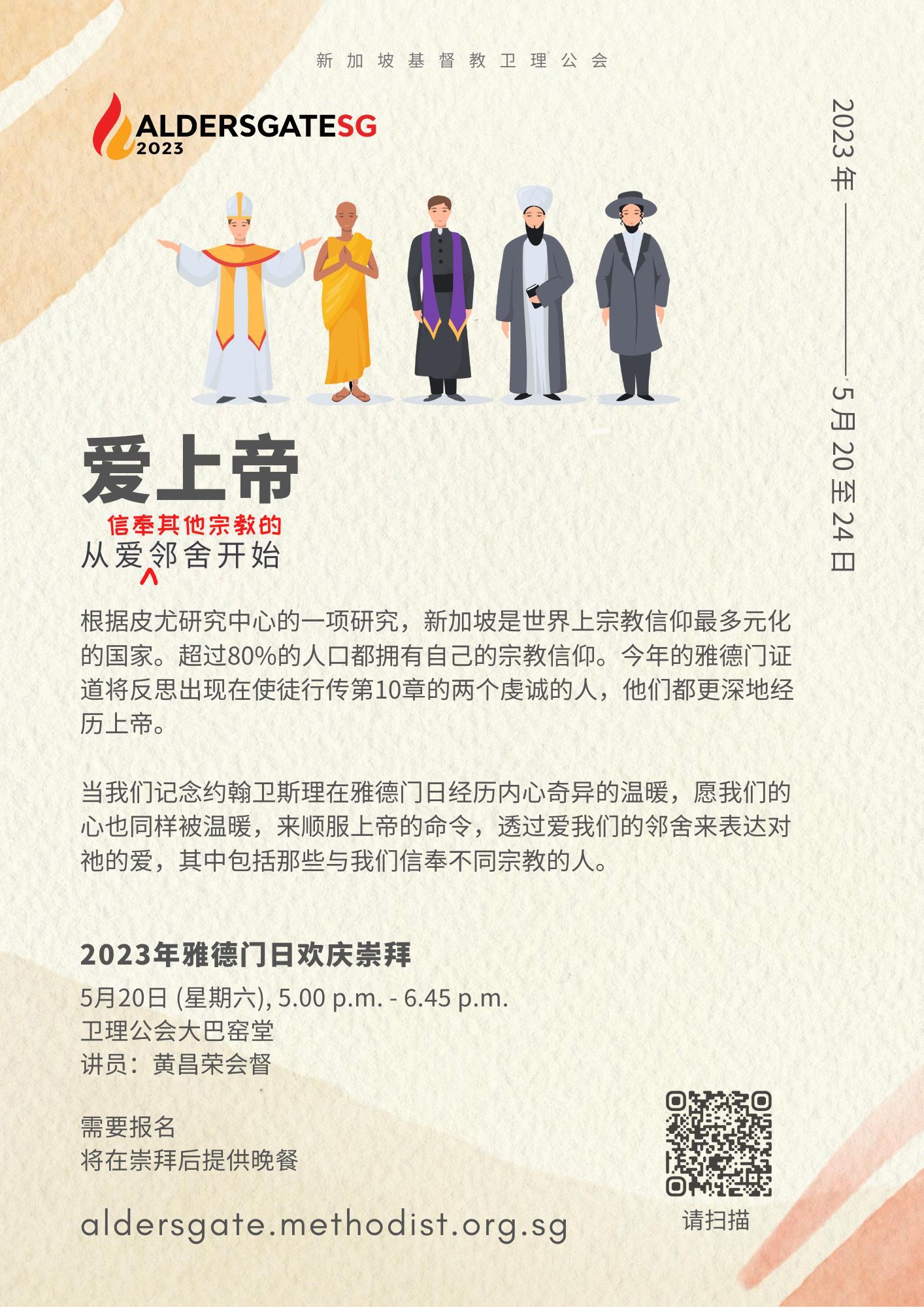 日期 讲员 讲题 经文 创世记证道系列 07/05 李文花传道 上帝起初的设计 创二15-24 14/05 沈云传道 与神同行 创六8-9,22,七1 来十一7 21/05 刘昌耀牧师 爱上帝-从爱信奉其他宗教的邻舍开始 28/05 熊志辉传道 父亲的期待 创廿四1-9