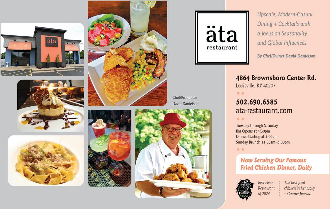 ÄTA 4863 Brownsboro Rd., 690-6585. FFormerly Anoosh Bistro, now owned by Chef David Danielson (äta means “to eat” in Swedish), and offering familiar elevated American dishes, small plates and shareables with thoughtful global twists; examples include pappardelle pasta with braised pork, cioppino, and grilled artichoke flower. But the single biggest hit to date has been DFC (Danielson Fried Chicken), using a top-secret recipe traceable to his late, lamented Old Stone Inn. It just might be Louisville’s finest. $$$$ L D p