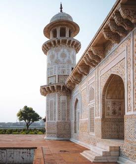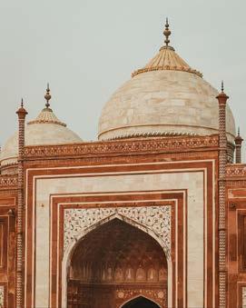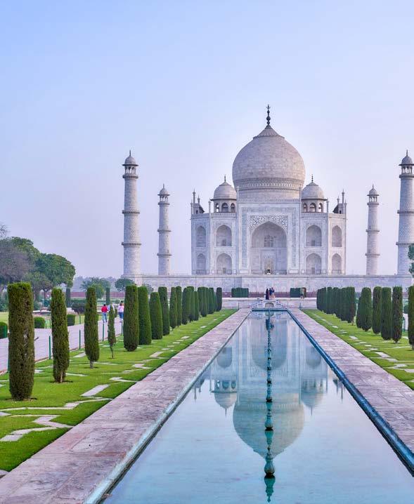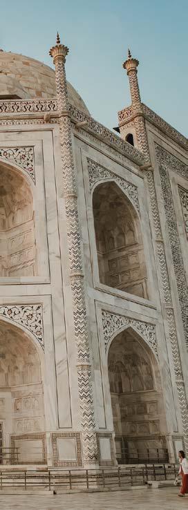 are embedded to form delicate floral and geometric patterns. Verses from the Quran, inscribed in elegant calligraphy, enhance the sanctity of the mausoleum, adding a spiritual dimension to its aesthetic beauty. For travelers, the Taj Mahal is not simply an architectural site—it is an emotional experience. As one approaches through the grand gateway, the monument gradually reveals itself, framed perfectly against the sky. The sight of the Taj mirrored in the central reflecting pool leaves a lasting impression. Inside the mausoleum, the cenotaphs of Mumtaz Mahal and Shah Jahan lie beneath the soaring dome, though the real tombs rest quietly in a chamber below. The surrounding gardens, designed in the classical Mughal charbagh style, represent paradise on earth, with four quadrants divided by water channels. The calm atmosphere encourages visitors to linger, reflect, and absorb the beauty around them.