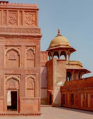 Across the river from the Taj stands the red sandstone enclosure of Agra Fort, less a single building than a city within walls. Built by Akbar and enlarged by his successors, the fort’s compound once held the machinery of empire: administrative halls, private apartments, gardens, mosques, and service quarters. While the thick ramparts are defensive, the interiors reveal a different face of rulership: the Diwan-iAm with its open courtyard for public audiences, the Diwan-i-Khas where favoured courtiers may have stood, and the marble pavilions where private conversation and pleasure took