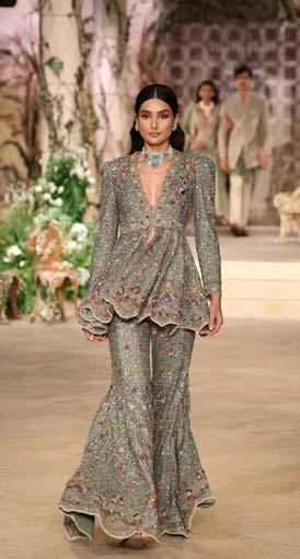 Roseroom by Isha Jajodia opened with Whispers of Love to Myself, a collection that explored femininity through the lens of self-love, transformation, and empowerment. Divided into four chapters from innocence to selfactualisation, it featured soft pastels, sculpted corsets, sweeping capes, veils, feathered skirts, and unembellished lace – a subtle yet recurring motif.