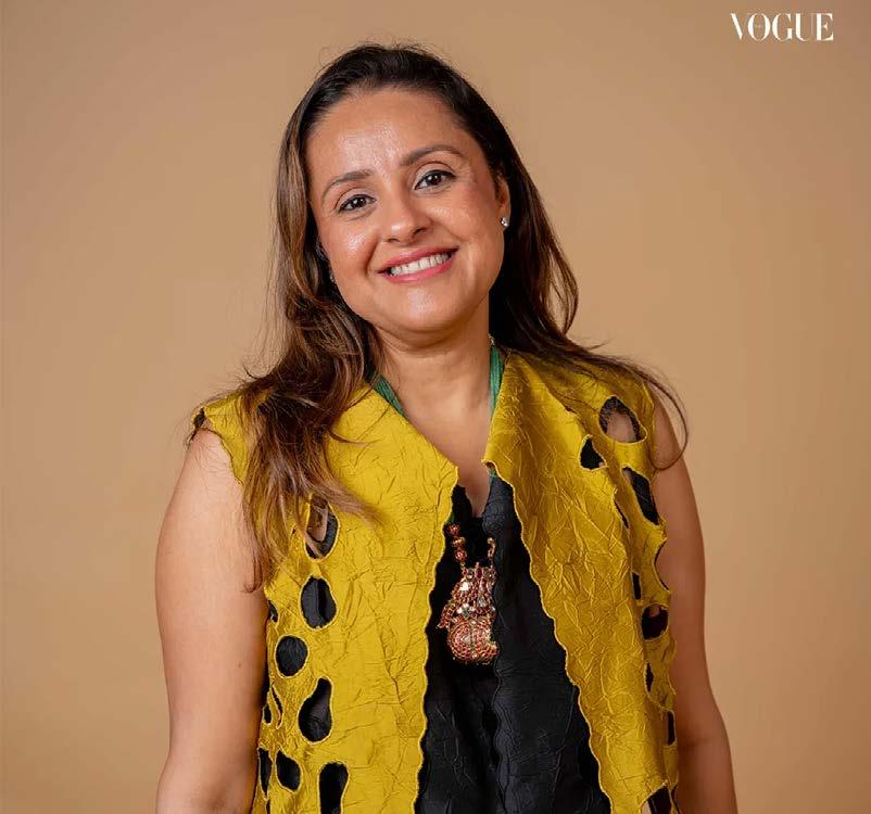 Manjul Gupta, founder of Bodycraft Salon and Spa, wore her mother-in-law’s 80-yearold gold bangle, paired with a restored Banarasi sari, one she wore for her wedding. Her daughter Swati Gupta, who married into a South Indian family, chose a handembroidered mundu sari that once belonged to her husband’s grandmother, which she also wore at her own wedding.