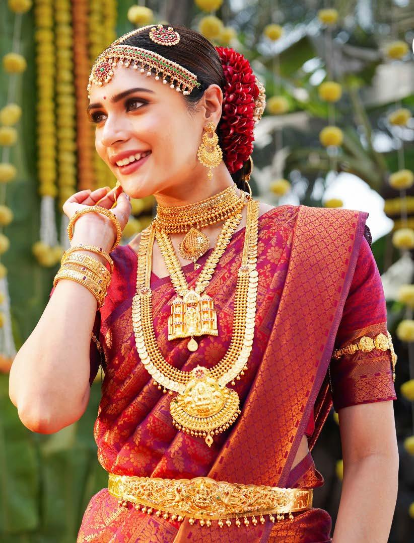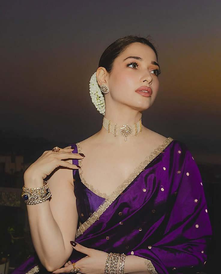 The Kanjeevaram sari has long held its status as one of the most celebrated textiles in Indian fashion. Known for its exquisite weave, luxurious texture, and lustrous finish, it has been a staple in every South Indian bride’s trousseau. What sets this version apart is the lightness of the drape—JADE by Monica & Karishma have reimagined the traditionally heavy Kanjeevaram for the modern woman, offering a blend of comfort and grandeur. The rich purple hue of Tamannaah’s sari carries deep cultural significance. Associated with royalty and spirituality in Indian tradition, purple evokes a sense of mystique and sophistication. When rendered on Kanjeevaram silk, the colour’s vibrancy is heightened, giving the fabric a radiant, almost ethereal quality.