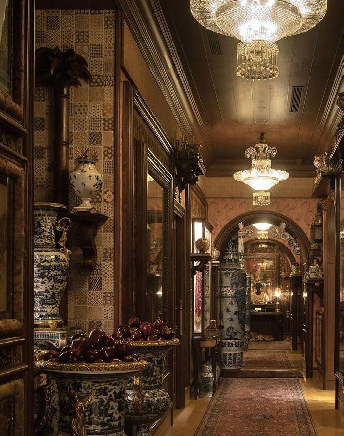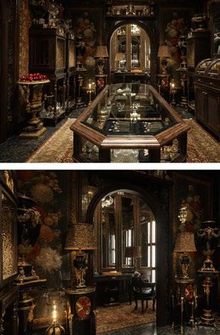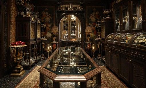 The interiors read unmistakably like a lived-in archive. Vintage mirrors, carved cabinets, jeweltoned drapery, Persian-inspired rugs, and carefully placed objets d’art create a layered visual language. Lighting is orchestrated to form tableaux, placing craftsmanship and display design on equal footing. The overall mood is nostalgic—a Sabyasachi hallmark—yet executed with the precision expected of a flagship boutique located within a luxury hotel. Beyond the spectacle, the boutique operates as a fully