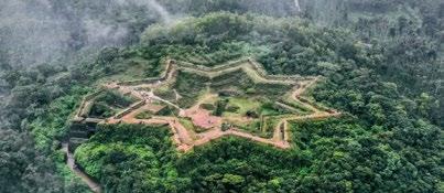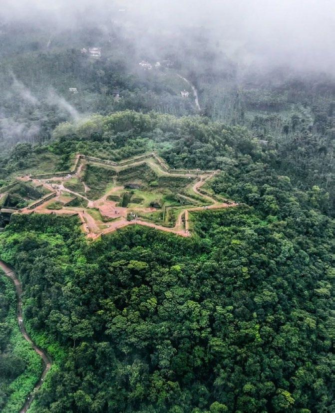 One of Sakleshpur’s most iconic landmarks is Manjarabad Fort, constructed in 1792 by the visionary ruler Tipu Sultan. What sets this fort apart is its unique 8-pointed star design, inspired by European star forts, which enhanced its defensive capabilities. The fort stands as a testament to Tipu Sultan’s military ingenuity and architectural foresight. Visitors can climb approximately 250 steps to reach the top, where panoramic views of coffee plantations, mist-covered valleys, and rolling hills await.The fort’s walls, cannons, and strategic layout offer a glimpse into 18th-century military architecture. Photographers, history enthusiasts, and travelers seeWking a serene spot to absorb the landscape will find the fort an unforgettable experience. Sunset from Manjarabad Fort is particularly mesmerizing, as the valleys and plantations are bathed in golden light, with clouds weaving through the hills.