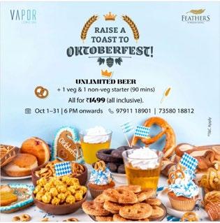 Feathers Hotel is rolling out the barrels this October, bringing the spirit of Bavaria to Chennai with a lively Oktoberfest celebration at Vapor Lounge Bar. Guests are invited to raise a toast, enjoy unlimited beer, and indulge in mouthwatering starters, all amidst a festive Bavarian-inspired atmosphere. From October 1st –31st,6 PM onwards, immerse yourself in 90 minutes of unlimited beer along with a choice of one vegetarian and one non-vegetarian starter— available at an all-inclusive price of ₹1499. The lounge transforms into a Bavarian wonderland, complete with traditional décor, hearty bites, and a cheerful vibe perfect for camaraderie. Whether it’s a casual evening or a festive gathering with friends, Oktoberfest at Vapor promises frothy pours, hearty flavors, and unforgettable memories.