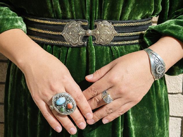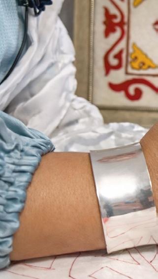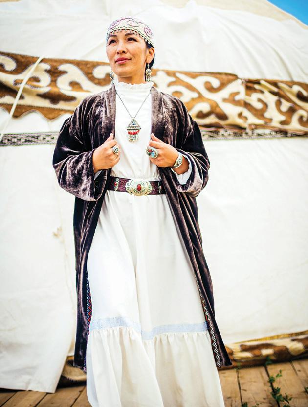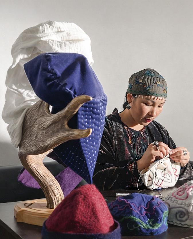 worn by adult men. It is now extremely rare. Many believe it to be a Kyrgyz hat, although Kazakhs also wore them. This kalpak was felted and also protected from the sun. We mustn’t forget the belbeu, a wide belt, an important element of the men’s costume that not only served as decoration but also had a practical function: it held a knife, tobacco pouch, and bags. All these elements of traditional costume carry deep meaning and reflect the culture that we must preserve and pass on to future generations,” says the ethnic designer. The designer develops signature pieces, creating lightweight garments in just two days, while a full, hand-embroidered suit can take up to a year, depending on its complexity.
