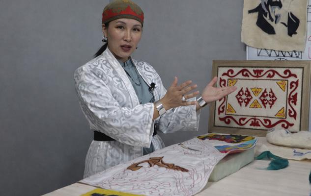 Madina Kuandyk master’s ancient techniques rarely encountered in modern sewing. For example, one such embroidery technique is “syrma” (Syrmaq әдісі), which is felt embroidery. In this technique, multicolored pieces of felt are cut out and sewn onto a background, creating complex patterns.