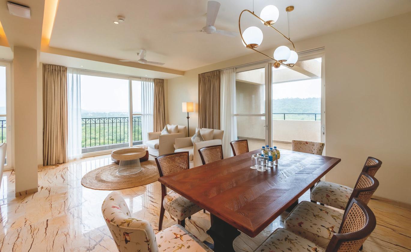 Indulge in a tranquil setting of 260 square metres presidential suite, where every corner emphasizes on elegance, utmost comfort, and contemporary architecture. The suite comprises of an expansive living room welcoming the natural light, a dining area, master bedroom & an adjoining bedroom, walking closet and a kitchenette. To enhance the magnificent experience, the private terrace hosts a lounge area with barbeque facilities overlooking the panoramic view of Sinquerim landscape and Nerul river.