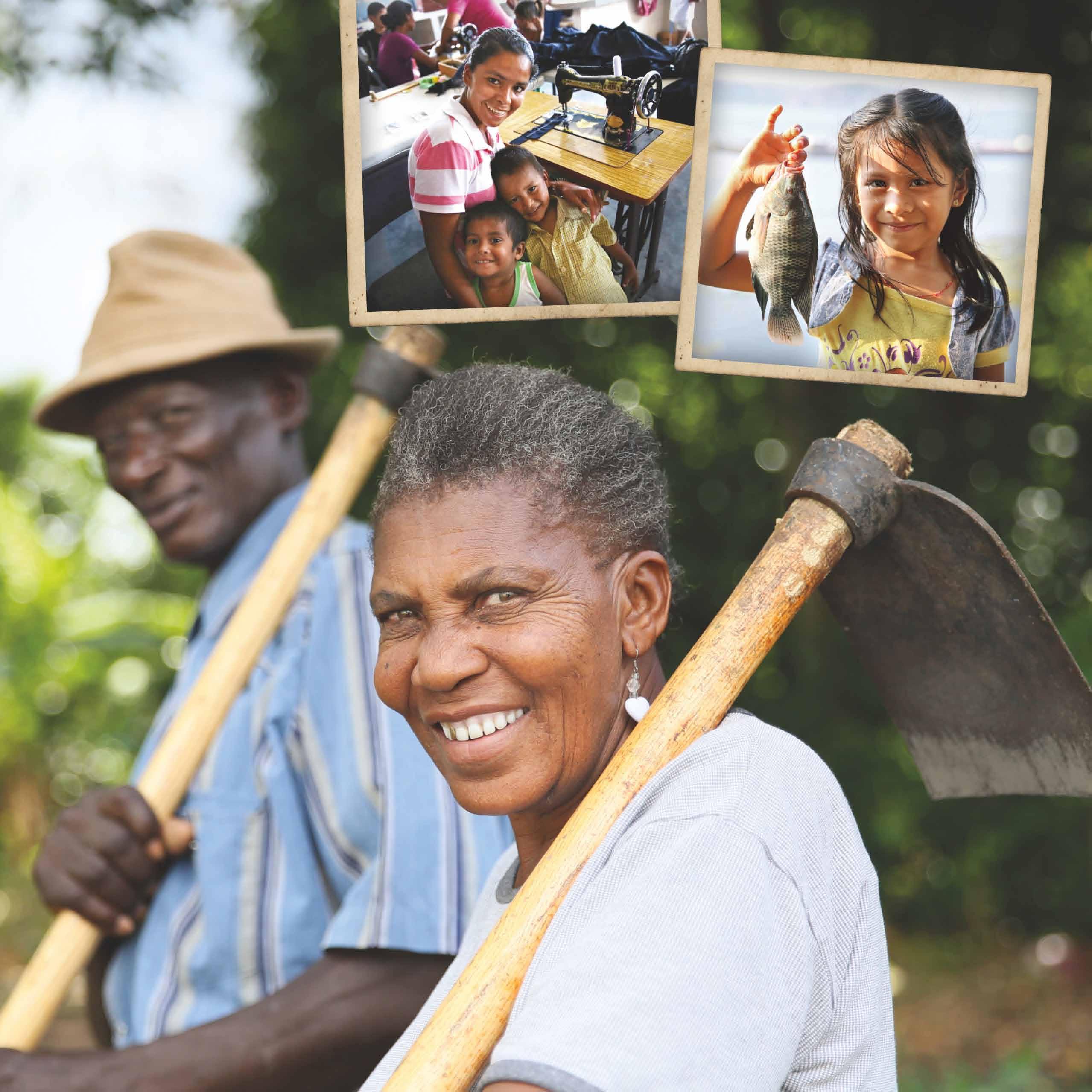 “Give her a reward of her labors, and let her works praise her at the city gates.” (Proverbs 31:31)LEFT TO RIGHT: Savveur and Rose carry agricultural tools they use on their community vegetable garden in Chantal, Norma takes part in the Food For The Poor-sponsored sewing program in La Esperanza village in Honduras. Erica, 5, holds up a tilapia from a Food For The Poor-sponsored tilapia hatchery project in Lake Ilopango, El Salvador.