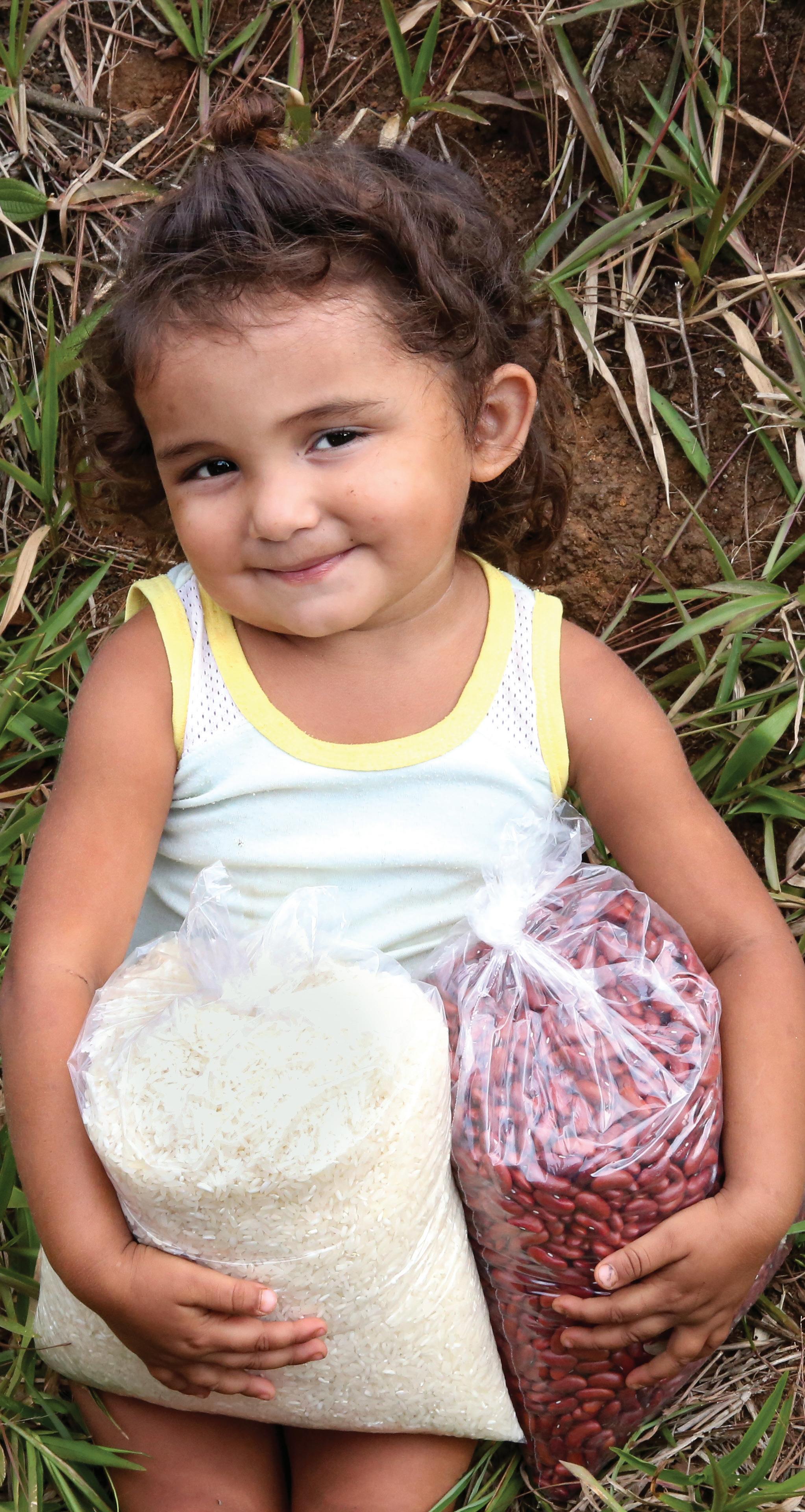 Sandra, 2, smiles while holding bags of rice and beans as part of the food distribution her family received in Honduras.