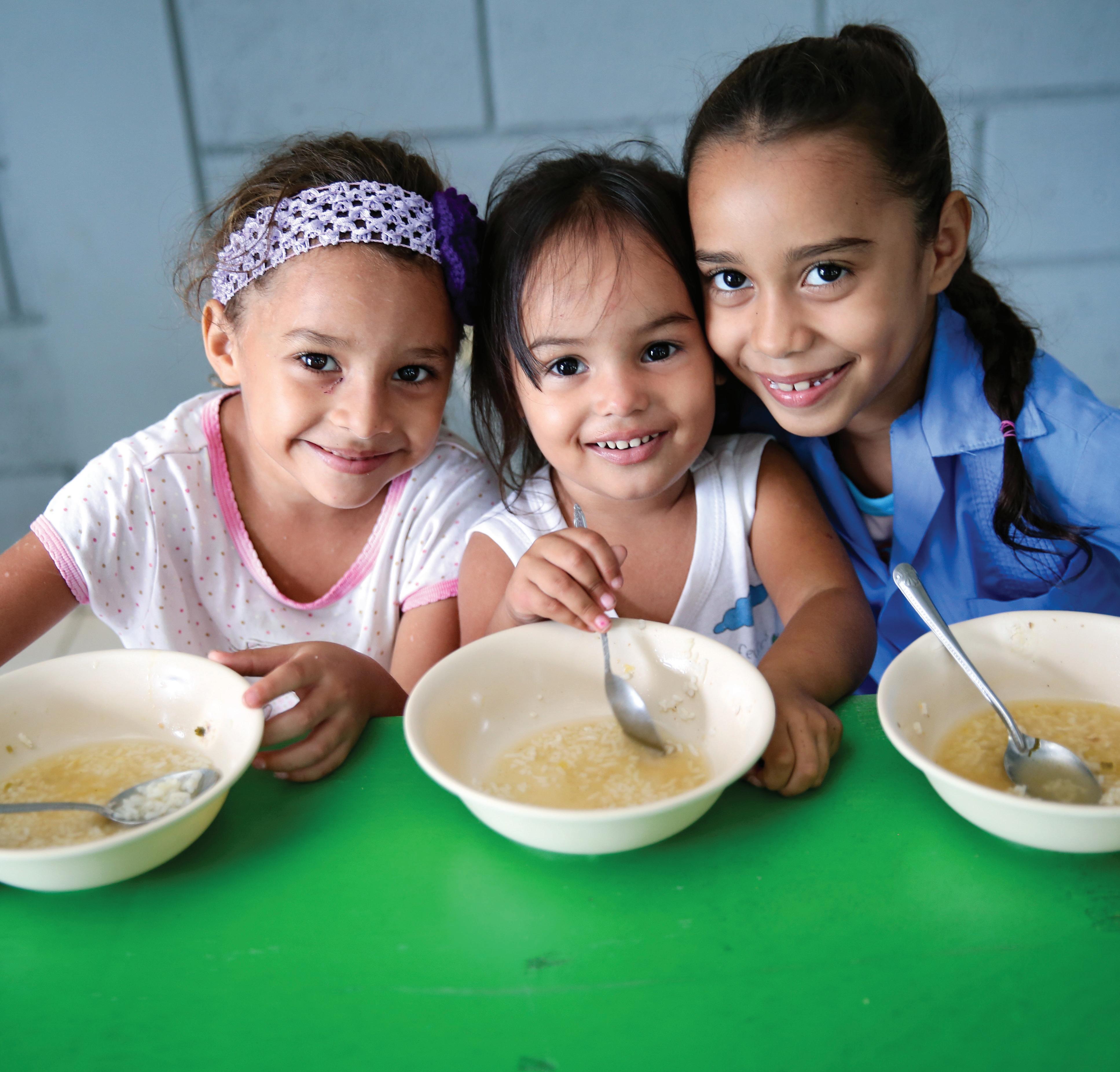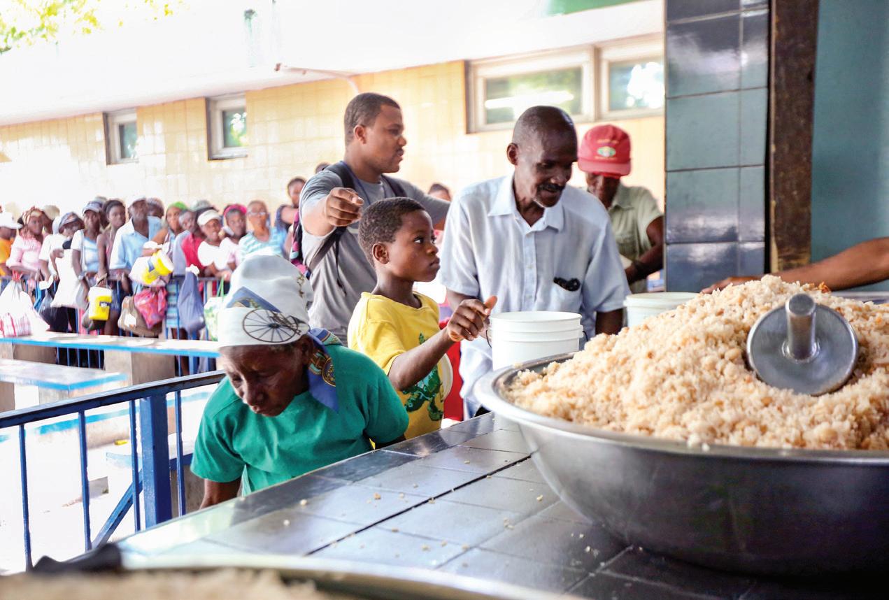 Siblings Valeria, Brittany and Genesis eat lunch at a Food For The Poor-sponsored feeding center in Puerto Cortes, Honduras. People line up at the Food For The Poor feeding center in Port-au-Prince, Haiti, to receive the nutritious food they will take back to their families.