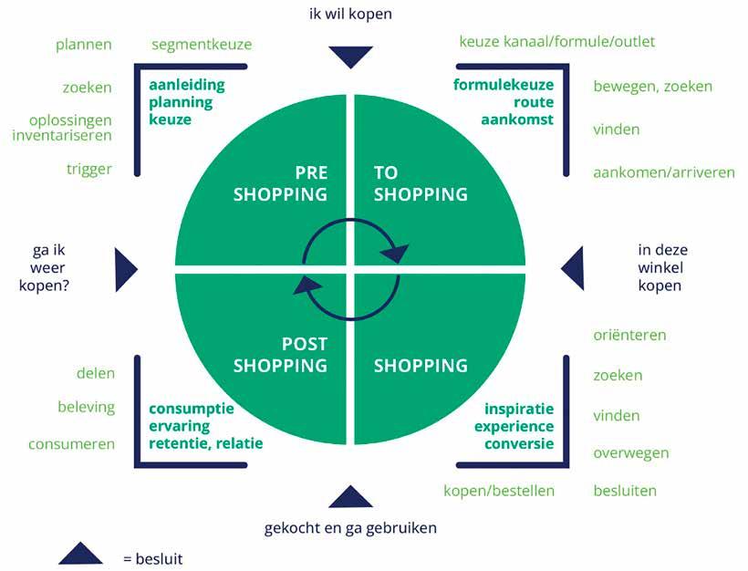 De eerste fase: Pre-shopping In de Pre-Shopping fase ontstaat de behoefte. Per type behoefte zal dit verschillen. Als straks in de lente de zon weer gaat schijnen, krijgen mensen spontaan en ongepland behoefte aan ijs of een terrasbezoek. Een ander voorbeeld: Als ik weet dat ik morgen een lange autoreis ga maken, ontstaat er behoefte om die reis te breken met een snack of energie voor onderweg. Merken kunnen via social media of andere communicatie (touchpoints) proberen die behoefte te beïnvloeden. De tweede fase: To-Shopping