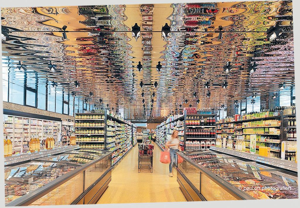 Supermarkten worden vaak afgedaan als fantasieloze productmagazijnen. Maar: dat hoeven ze natuurlijk niet te zijn. De Oostenrijkse supermarktketen MPreis (257 vestigingen, met name in Tirol) staat bekend om z’n bijzondere supermarkten qua architectuur en inrichting. Sterker: iedere vestiging is uniek. Wat te denken van dit spectaculaire ‘blingbling’-plafond van het filiaal in Dampffeld?