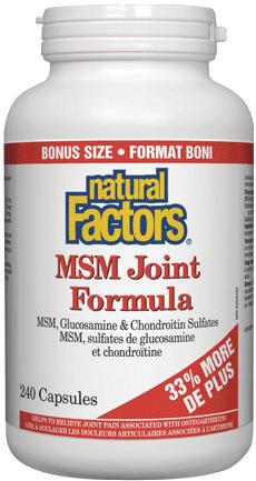 Natural Factors MSM Joint Formula contains MSM, glucosamine sulfate, and chondroitin sulfate for triple-action joint health support. These top three joint support nutrients are combined in one formula to improve joint lubrication, fight inflammation, and help repair cartilage. This product works to relieve joint pain associated with osteoarthritis and protects against cartilage deterioration.