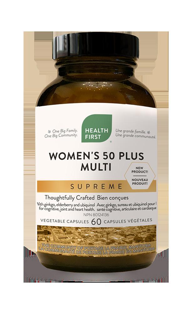 Health First’s Women’s 50 Plus Multi Supreme offers highly bioavailable nutrients that give you the most out of your multi! It features Aquamin™ calcium and magnesium derived from sustainably sourced red algae for ultra-absorbability as well as methylated B vitamins and buffered vitamin C. Our formula includes patented ElderCraft® European black elderberry not only to support immune health but also to relieve joint pain, as extensively studied. Ginkgo biloba and Kaneka Ubiquinol® have also been added to this well-rounded formula to support cognitive and heart health.