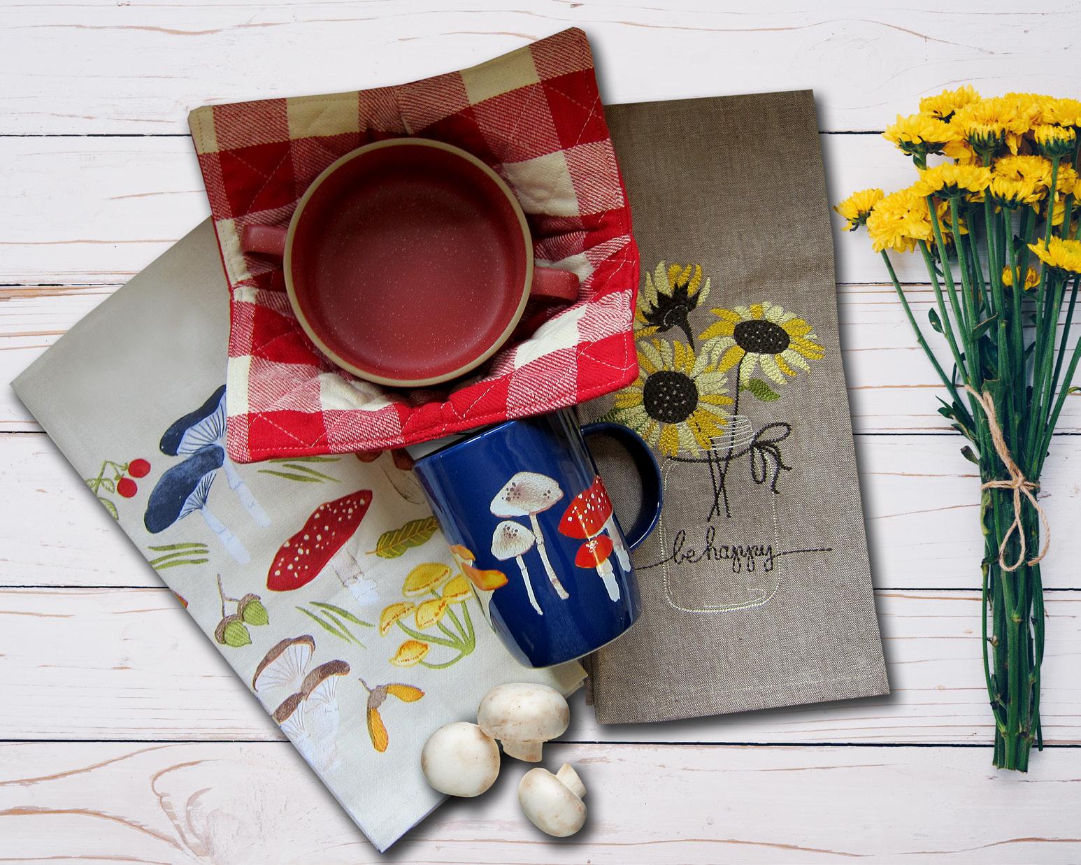 NAPKINS, NAPKIN RINGS, MUGS, TABLE RUNNERS, TEACLOTHS, PUMPKINS, GOURDS, SQUASH, PLUS LOTS MORE! ALSO MAKE THOUGHTFUL GIFTS.