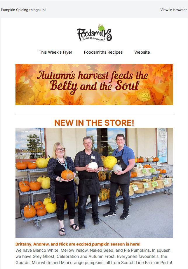to organizations who support their mission SAVE $1 PRICES IN EFFECT THURSDAY, SEP 28 TO THURSDAY OCT 5 ONLY UNLESS OTHERWISE STATED. WHILE SUPPLIES LAST. NO RAIN CHECKS OR SUBSTITUTIONS. IMAGES ARE REPRESENTATIONAL ONLY. PRODUCTS MAY NOT BE EXACTLY AS SHOWN. E & OE. FRESH DEALS THROUGHOUT THE STORE JOIN OUR 6000+ SUBSCRIBERS WHO ENJOY OUR E-NEWS EVERY WEEK! Subscribe to our E-News for the latest tasty recipes, new product notifications, articles, tips, interesting links and lots more! Just head over to our website at foodsmiths.com and click on newsletter sign-up!